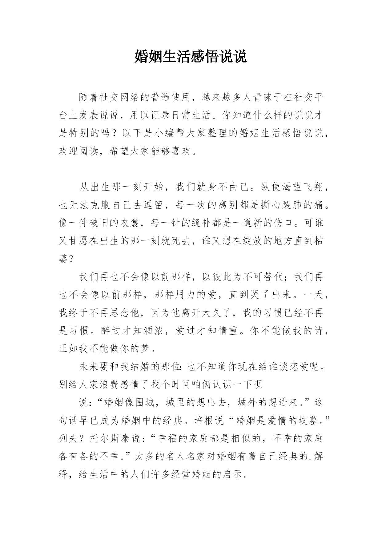 婚姻生活感悟说说随着社交网络的普遍使用,越来越多人青睐于在社交平台上发表说说,用以记录日常生活。你知道什么样的说说才是特别的吗?以下是小编帮大家整理的婚姻生活感悟说说,欢迎阅读,希望大家能够喜欢。从出生那一刻开始,我们就身不由己。纵使渴望飞翔,也无法克服自己去逗留,每一次的离别都是撕心裂肺的痛。像一件破旧的衣裳,每一针的缝补都是一道新的伤口。可谁又甘愿在出生的那一刻就死去,谁又想在绽放的地方直到枯萎?我们再也不会像以前那样,以彼此为不可替代;我们再也不会像以前那样,那样用力的爱,直到哭了出来。一天,我终于
