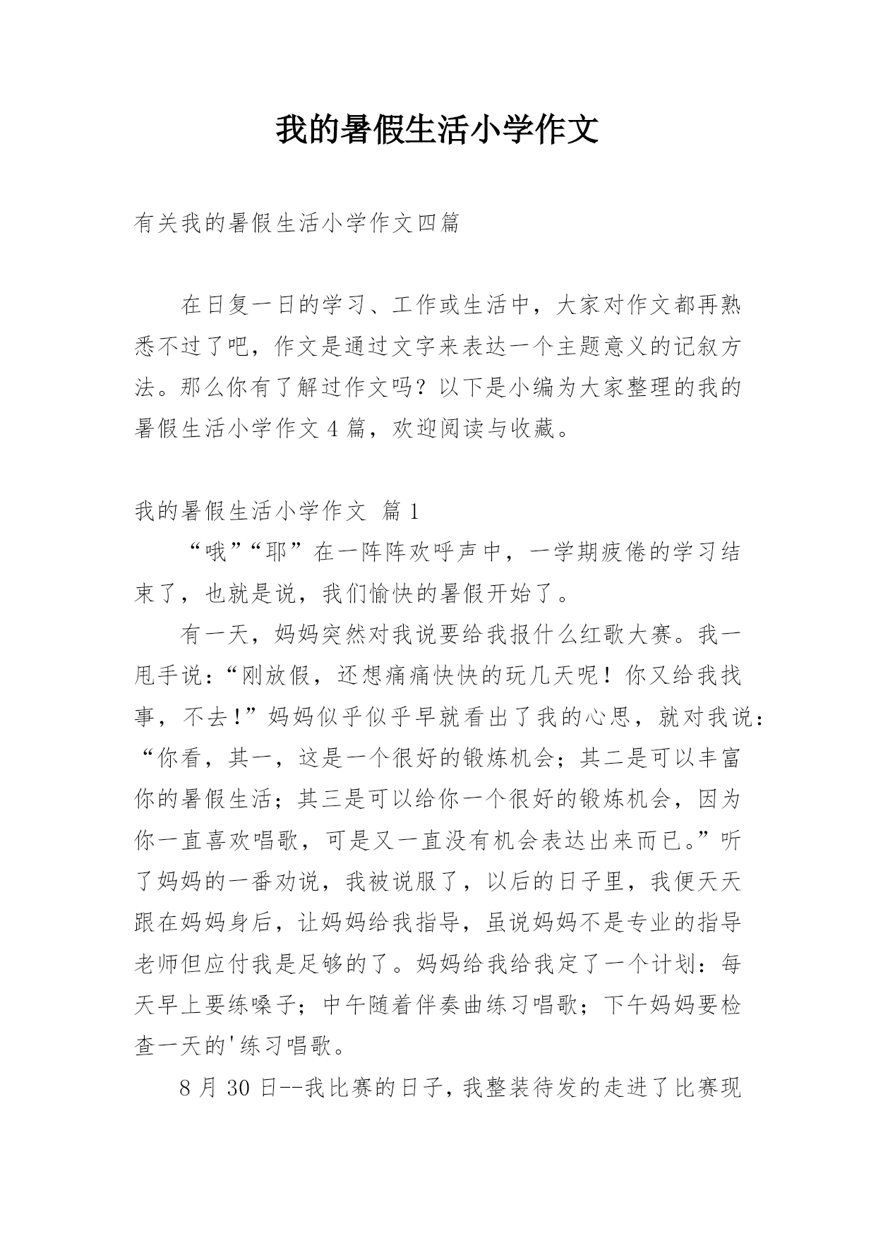 我的暑假生活小学作文有关我的暑假生活小学作文四篇在日复一日的学习、工作或生活中,大家对作文都再熟悉不过了吧,作文是通过文字来表达一个主题意义的记叙方法。那么你有了解过作文吗?以下是小编为大家整理的我的暑假生活小学作文4篇,欢迎阅读与收藏。我的暑假生活小学作文篇1“哦”“耶”在一阵阵欢呼声中,一学期疲倦的学习结束了,也就是说,我们愉快的暑假开始了。有一天,妈妈突然对我说要给我报什么红歌大赛。我一甩手说:“刚放假,还想痛痛快快的玩几天呢!你又给我找事,不去!”妈妈似乎似乎早就看出了我的心思,就对我说:“你看,