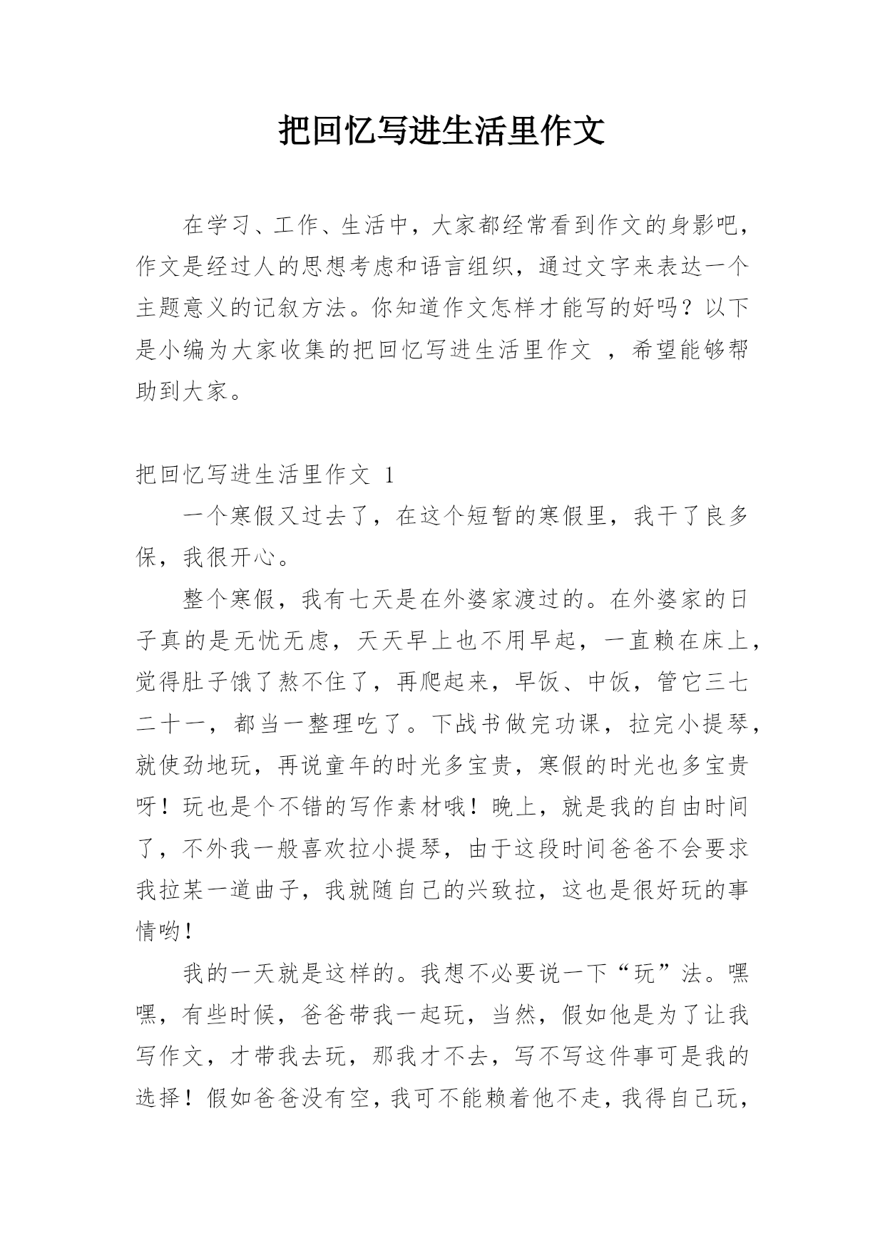 把回忆写进生活里作文在学习、工作、生活中,大家都经常看到作文的身影吧,作文是经过人的思想考虑和语言组织,通过文字来表达一个主题意义的记叙方法。你知道作文怎样才能写的好吗?以下是小编为大家收集的把回忆写进生活里作文,希望能够帮助到大家。把回忆写进生活里作文1一个寒假又过去了,在这个短暂的寒假里,我干了良多保,我很开心。整个寒假,我有七天是在外婆家渡过的。在外婆家的日子真的是无忧无虑,天天早上也不用早起,一直赖在床上,觉得肚子饿了熬不住了,再爬起来,早饭、中饭,管它三七二十一,都当一整理吃了。下战书做完功课,