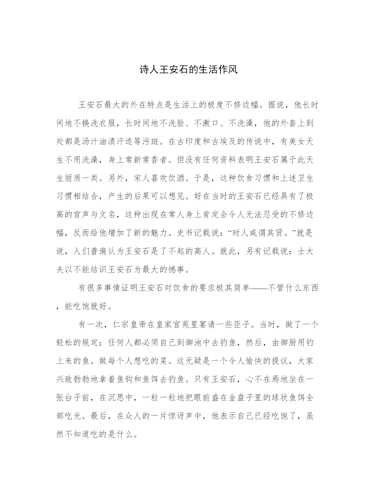 诗人王安石的生活作风王安石最大的外在特点是生活上的极度不修边幅。据说,他长时间地不换洗衣服,长时间地不洗脸、不漱口、不洗澡,他的外套上到处都是汤汁油渍汗迹等污斑。在古印度和古埃及的传说中,有美女天生不用洗澡,身上常新常香者。但没有任何资料表明王安石属于此天生丽质一类。另外,宋人喜欢饮酒。于是,这种饮食习惯和上述卫生习惯相结合,产生的后果可以想见。好在当时的王安石已经具有了极高的官声与文名,这种出现在常人身上肯定会令人无法忍受的不修边幅,反而给他增加了新的魅力。史书记载说:“时人咸谓其贤。”就是说,人们普遍