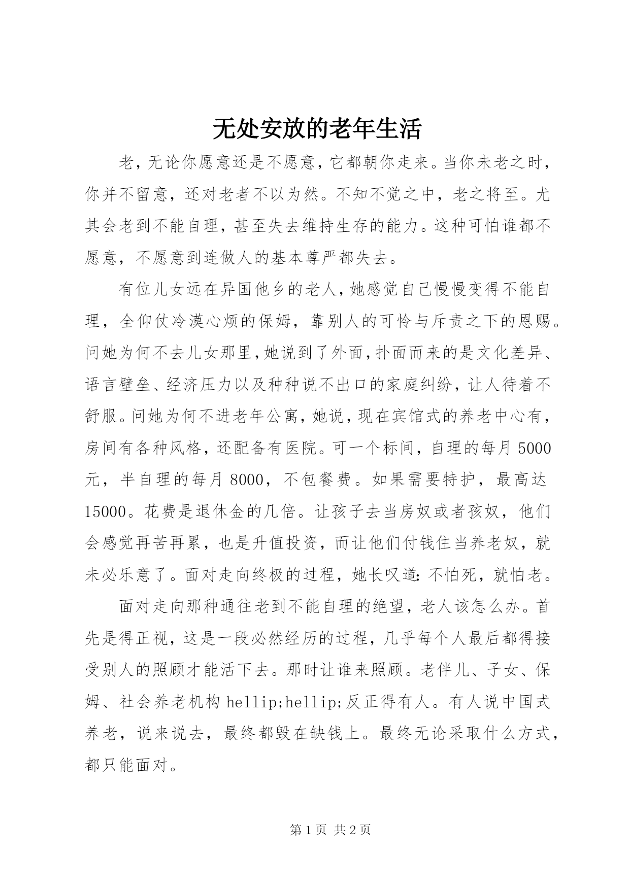 第PAGE\*Arabic\*MERGEFORMAT2页共NUMPAGES\*MERGEFORMAT2页无处安放的老年生活老,无论你愿意还是不愿意,它都朝你走来。当你未老之时,你并不留意,还对老者不以为然。不知不觉之中,老之将至。尤其会老到不能自理,甚至失去维持生存的能力。这种可怕谁都不愿意,不愿意到连做人的基本尊严都失去。有位儿女远在异国他乡的老人,她感觉自己慢慢变得不能自理,全仰仗冷漠心烦的保姆,靠别人的可怜与斥责之下的恩赐。问她为何不去儿女那里,她说到了外面,扑面而来的是文化差异、语言壁