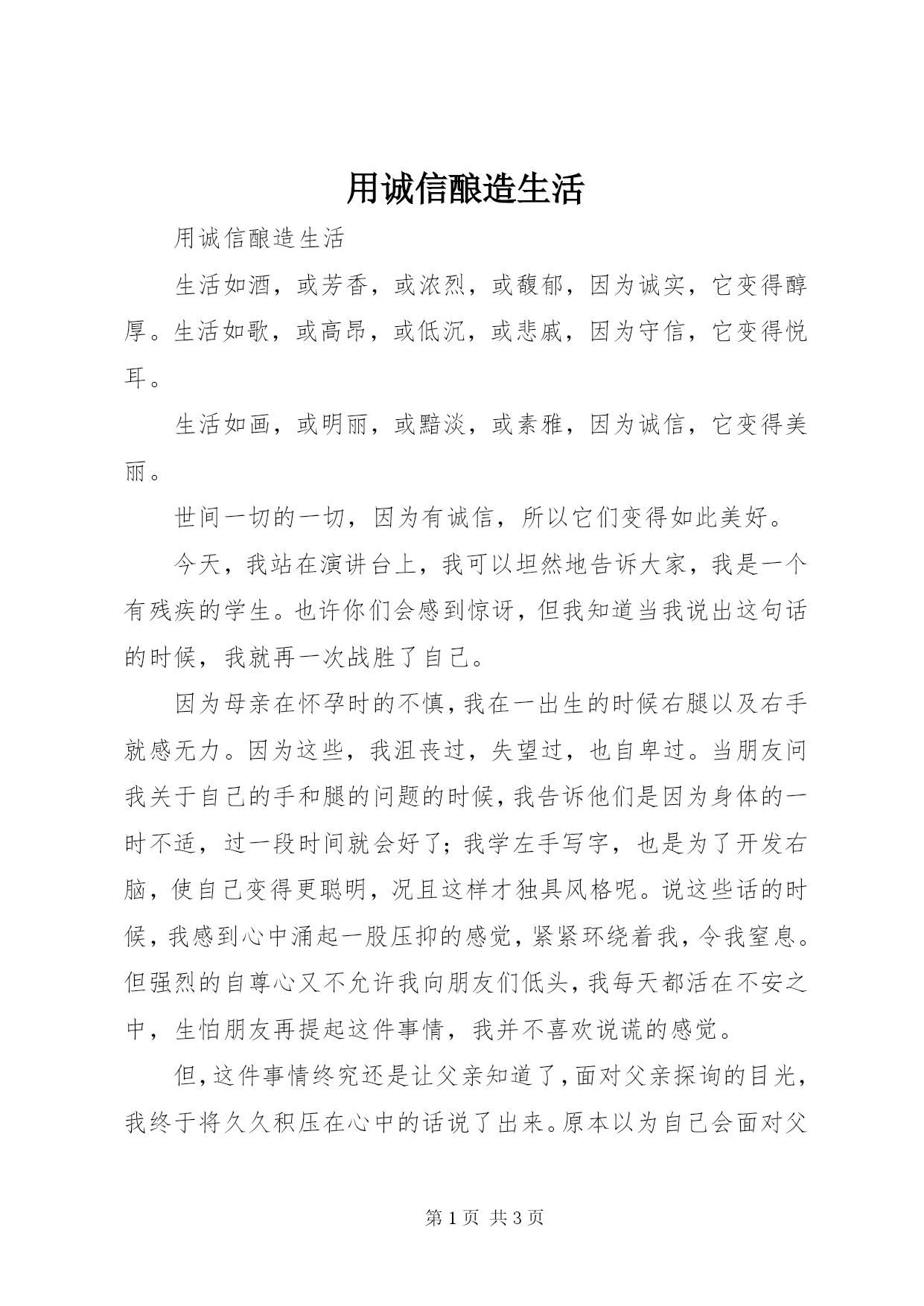 第PAGE\*Arabic\*MERGEFORMAT3页共NUMPAGES\*MERGEFORMAT3页用诚信酿造生活用诚信酿造生活生活如酒,或芳香,或浓烈,或馥郁,因为诚实,它变得醇厚。生活如歌,或高昂,或低沉,或悲戚,因为守信,它变得悦耳。生活如画,或明丽,或黯淡,或素雅,因为诚信,它变得美丽。世间一切的一切,因为有诚信,所以它们变得如此美好。今天,我站在演讲台上,我可以坦然地告诉大家,我是一个有残疾的学生。也许你们会感到惊讶,但我知道当我说出这句话的时候,我就再一次战胜了自己。因为母亲在