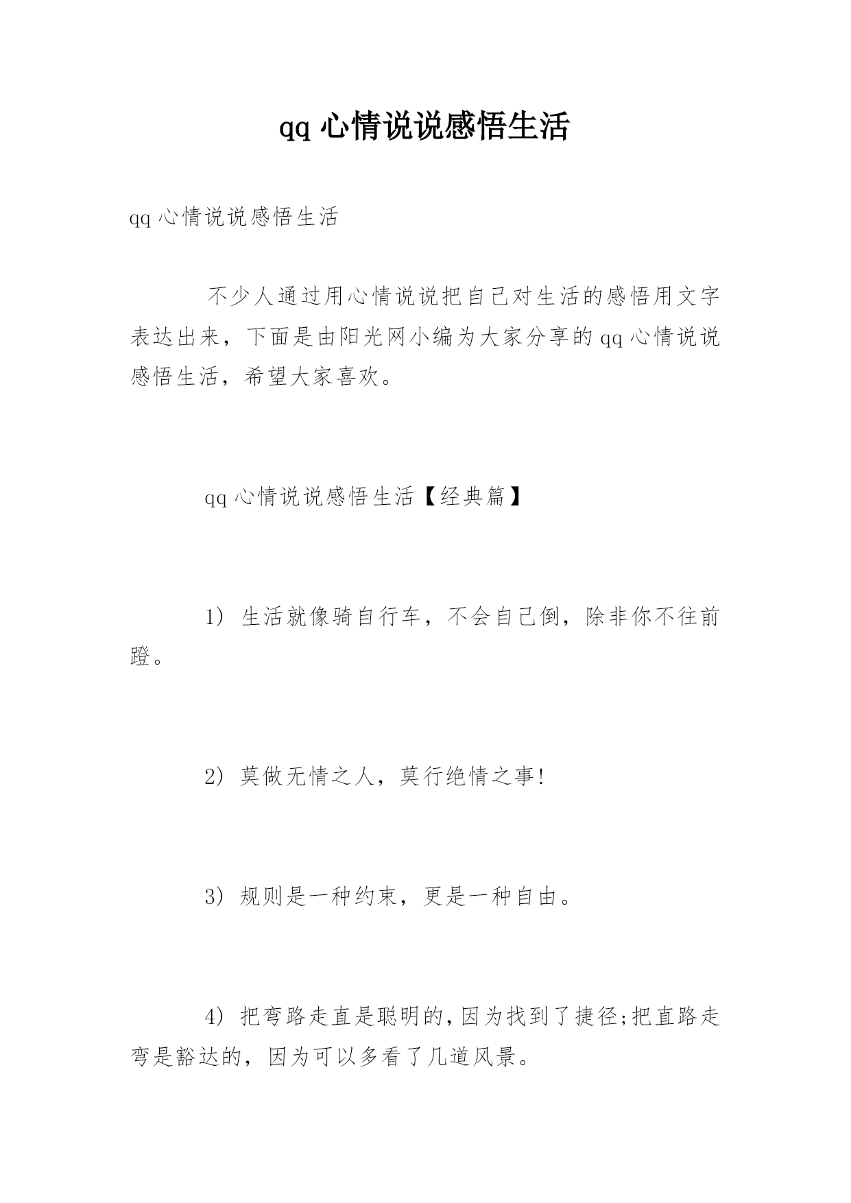 qq心情说说感悟生活qq心情说说感悟生活不少人通过用心情说说把自己对生活的感悟用文字表达出来,下面是由阳光网小编为大家分享的qq心情说说感悟生活,希望大家喜欢。qq心情说说感悟生活【经典篇】1)生活就像骑自行车,不会自己倒,除非你不往前蹬。2)莫做无情之人,莫行绝情之事!3)规则是一种约束,更是一种自由。4)把弯路走直是聪明的,因为找到了捷径;把直路走弯是豁达的,因为可以多看了几道风景。5)有时候一句微不足道的话可以让一个人感动半天。6)关于明天的事情,后天我们就都知道了。7)试着把光芒留给别人,不用太在