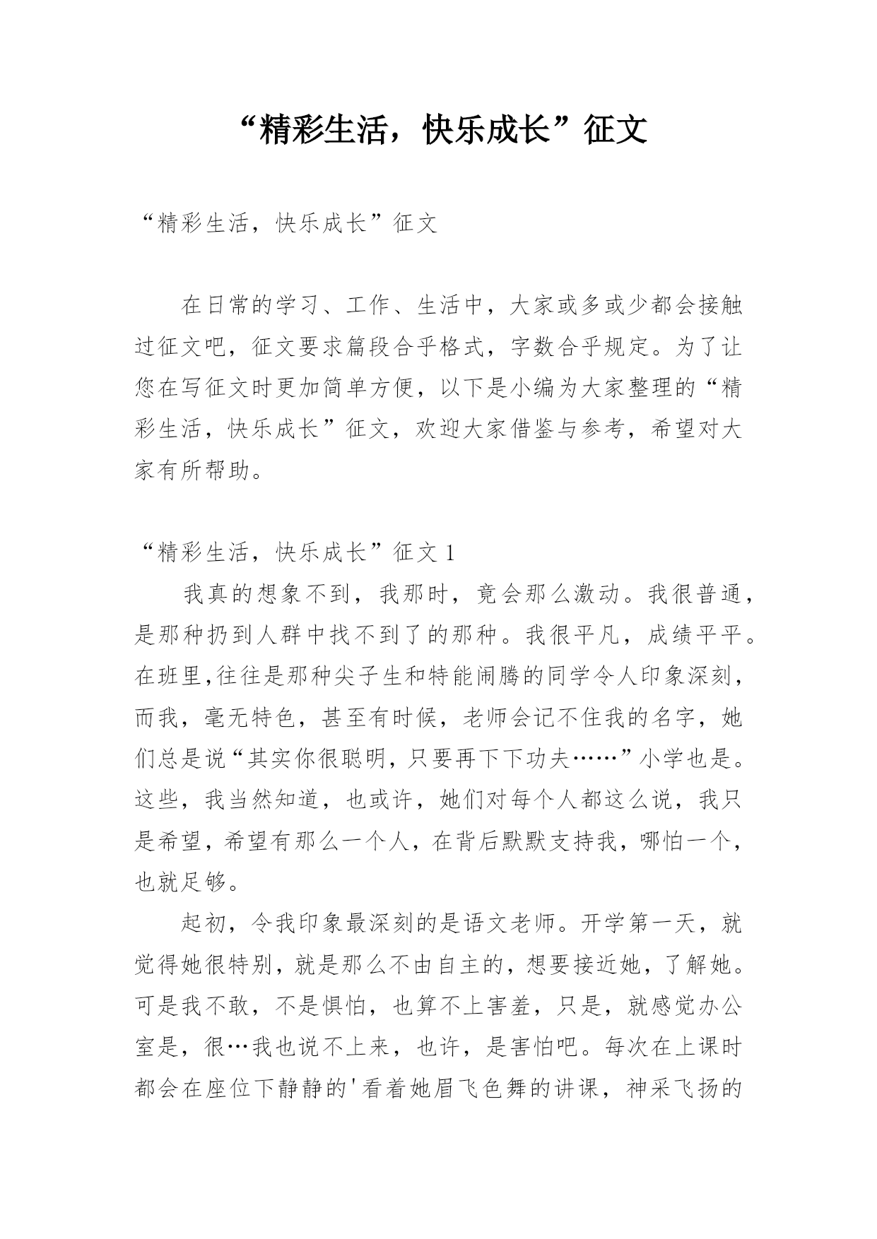 “精彩生活,快乐成长”征文“精彩生活,快乐成长”征文在日常的学习、工作、生活中,大家或多或少都会接触过征文吧,征文要求篇段合乎格式,字数合乎规定。为了让您在写征文时更加简单方便,以下是小编为大家整理的“精彩生活,快乐成长”征文,欢迎大家借鉴与参考,希望对大家有所帮助。“精彩生活,快乐成长”征文1我真的想象不到,我那时,竟会那么激动。我很普通,是那种扔到人群中找不到了的那种。我很平凡,成绩平平。在班里,往往是那种尖子生和特能闹腾的同学令人印象深刻,而我,毫无特色,甚至有时候,老师会记不住我的名字,她们总是说