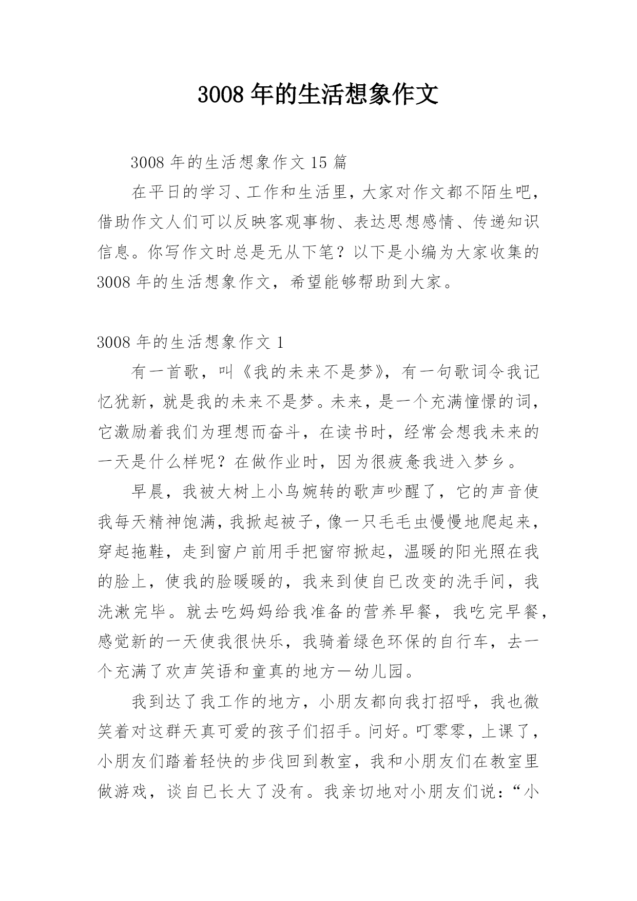 3008年的生活想象作文3008年的生活想象作文15篇在平日的学习、工作和生活里,大家对作文都不陌生吧,借助作文人们可以反映客观事物、表达思想感情、传递知识信息。你写作文时总是无从下笔?以下是小编为大家收集的3008年的生活想象作文,希望能够帮助到大家。3008年的生活想象作文1有一首歌,叫《我的未来不是梦》,有一句歌词令我记忆犹新,就是我的未来不是梦。未来,是一个充满憧憬的词,它激励着我们为理想而奋斗,在读书时,经常会想我未来的一天是什么样呢?在做作业时,因为很疲惫我进入梦乡。早晨,我被大树上小鸟婉转的