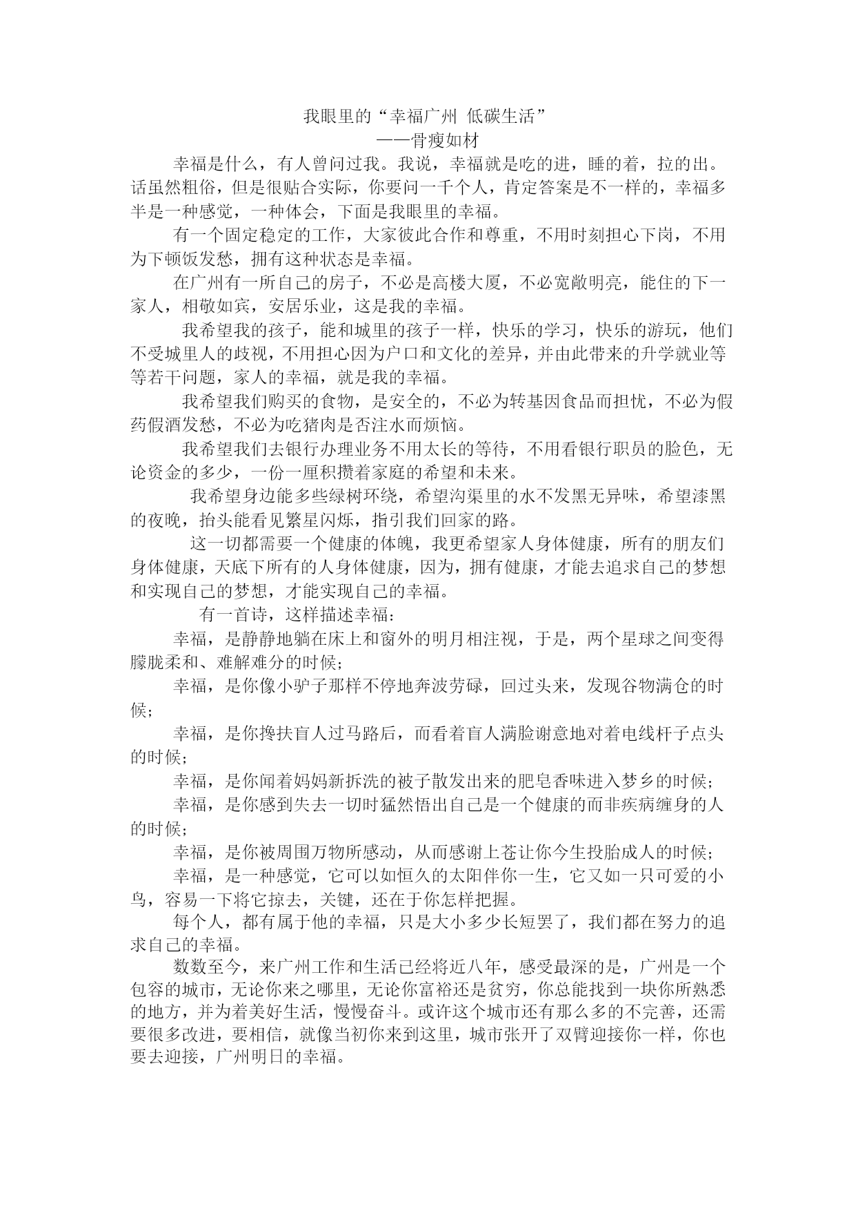 我眼里的“幸福广州低碳生活”——骨瘦如材幸福是什么,有人曾问过我。我说,幸福就是吃的进,睡的着,拉的出。话虽然粗俗,但是很贴合实际,你要问一千个人,肯定答案是不一样的,幸福多半是一种感觉,一种体会,下面是我眼里的幸福。有一个固定稳定的工作,大家彼此合作和尊重,不用时刻担心下岗,不用为下顿饭发愁,拥有这种状态是幸福。在广州有一所自己的房子,不必是高楼大厦,不必宽敞明亮,能住的下一家人,相敬如宾,安居乐业,这是我的幸福。我希望我的孩子,能和城里的孩子一样,快乐的学习,快乐的游玩,他们不受城里人的歧视,不用担心