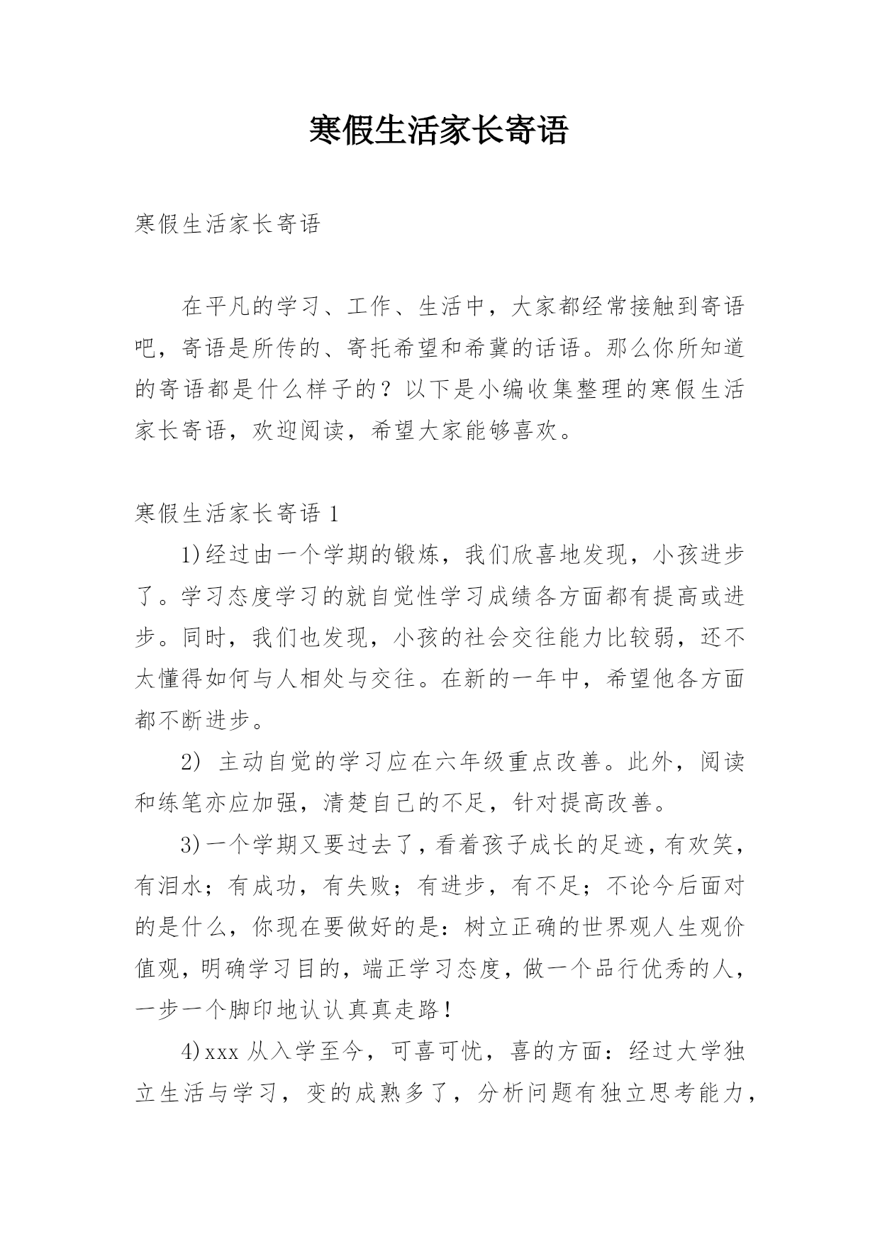 寒假生活家长寄语寒假生活家长寄语在平凡的学习、工作、生活中,大家都经常接触到寄语吧,寄语是所传的、寄托希望和希冀的话语。那么你所知道的寄语都是什么样子的?以下是小编收集整理的寒假生活家长寄语,欢迎阅读,希望大家能够喜欢。寒假生活家长寄语11)经过由一个学期的锻炼,我们欣喜地发现,小孩进步了。学习态度学习的就自觉性学习成绩各方面都有提高或进步。同时,我们也发现,小孩的社会交往能力比较弱,还不太懂得如何与人相处与交往。在新的一年中,希望他各方面都不断进步。2)主动自觉的学习应在六年级重点改善。此外,阅读和练笔