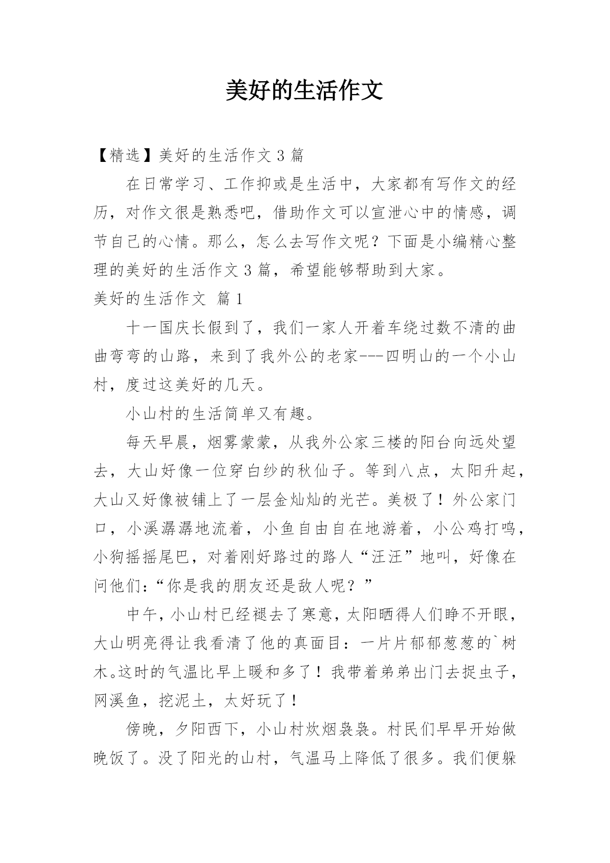 美好的生活作文【精选】美好的生活作文3篇在日常学习、工作抑或是生活中,大家都有写作文的经历,对作文很是熟悉吧,借助作文可以宣泄心中的情感,调节自己的心情。那么,怎么去写作文呢?下面是小编精心整理的美好的生活作文3篇,希望能够帮助到大家。美好的生活作文篇1十一国庆长假到了,我们一家人开着车绕过数不清的曲曲弯弯的山路,来到了我外公的老家---四明山的一个小山村,度过这美好的几天。小山村的生活简单又有趣。每天早晨,烟雾蒙蒙,从我外公家三楼的阳台向远处望去,大山好像一位穿白纱的秋仙子。等到八点,太阳升起,大山又好