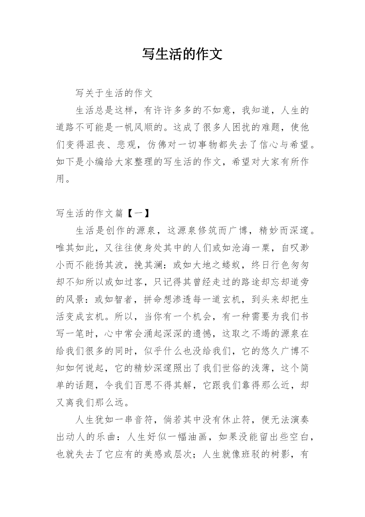 写生活的作文写关于生活的作文生活总是这样,有许许多多的不如意,我知道,人生的道路不可能是一帆风顺的。这成了很多人困扰的难题,使他们变得沮丧、悲观,仿佛对一切事物都失去了信心与希望。如下是小编给大家整理的写生活的作文,希望对大家有所作用。写生活的作文篇【一】生活是创作的源泉,这源泉修筑而广博,精妙而深邃。唯其如此,又往往使身处其中的人们或如沧海一粟,自叹渺小而不能扬其波,挽其澜:或如大地之蝼蚁,终日行色匆匆却不知所以或如过客,只记得其曾经走过的路途却忘却道旁的风景:或如智者,拼命想渗透每一道玄机,到头来却把