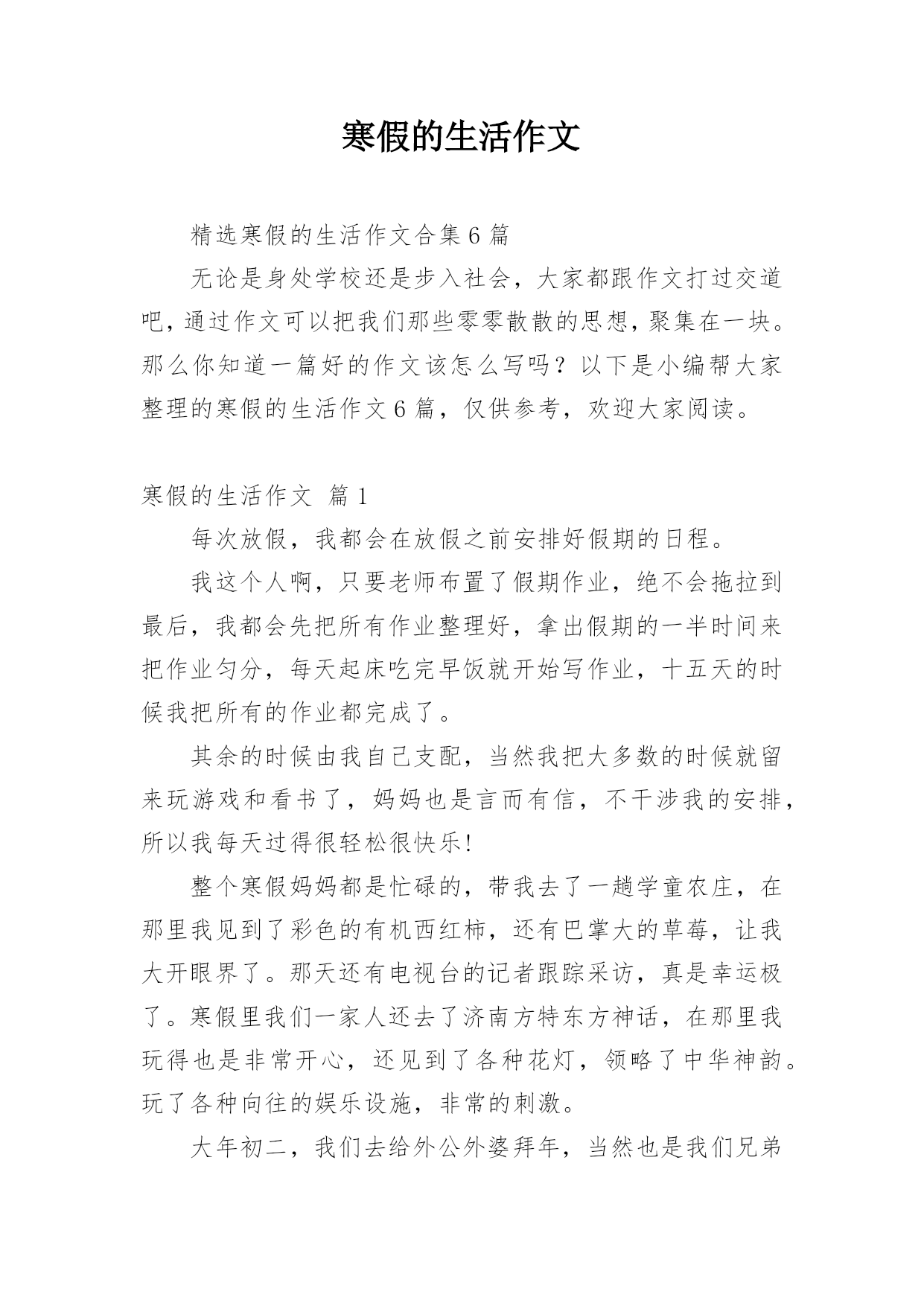 寒假的生活作文精选寒假的生活作文合集6篇无论是身处学校还是步入社会,大家都跟作文打过交道吧,通过作文可以把我们那些零零散散的思想,聚集在一块。那么你知道一篇好的作文该怎么写吗?以下是小编帮大家整理的寒假的生活作文6篇,仅供参考,欢迎大家阅读。寒假的生活作文篇1每次放假,我都会在放假之前安排好假期的日程。我这个人啊,只要老师布置了假期作业,绝不会拖拉到最后,我都会先把所有作业整理好,拿出假期的一半时间来把作业匀分,每天起床吃完早饭就开始写作业,十五天的时候我把所有的作业都完成了。其余的时候由我自己支配,当然