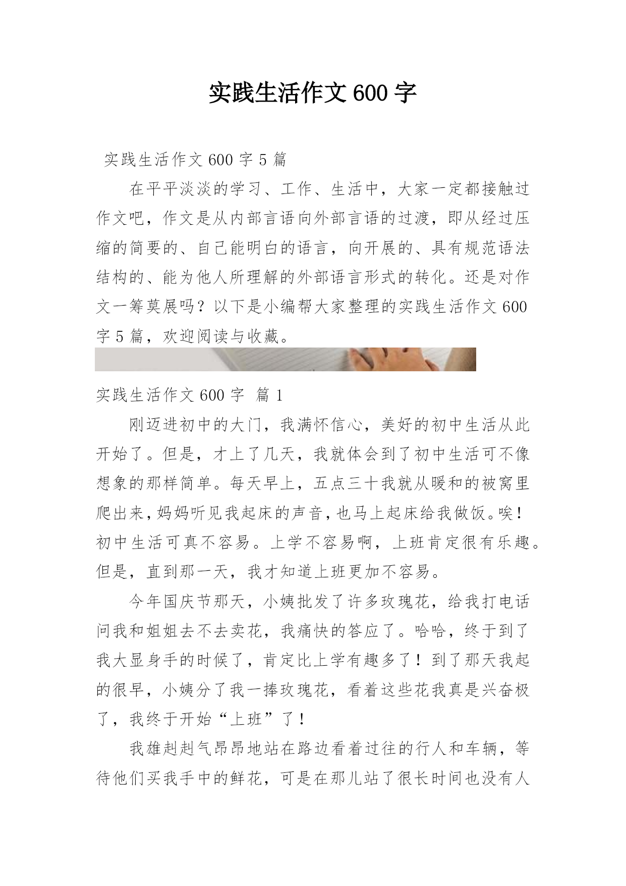 实践生活作文600字实践生活作文600字5篇在平平淡淡的学习、工作、生活中,大家一定都接触过作文吧,作文是从内部言语向外部言语的过渡,即从经过压缩的简要的、自己能明白的语言,向开展的、具有规范语法结构的、能为他人所理解的外部语言形式的转化。还是对作文一筹莫展吗?以下是小编帮大家整理的实践生活作文600字5篇,欢迎阅读与收藏。实践生活作文600字篇1刚迈进初中的大门,我满怀信心,美好的初中生活从此开始了。但是,才上了几天,我就体会到了初中生活可不像想象的那样简单。每天早上,五点三十我就从暖和的被窝里爬出来,