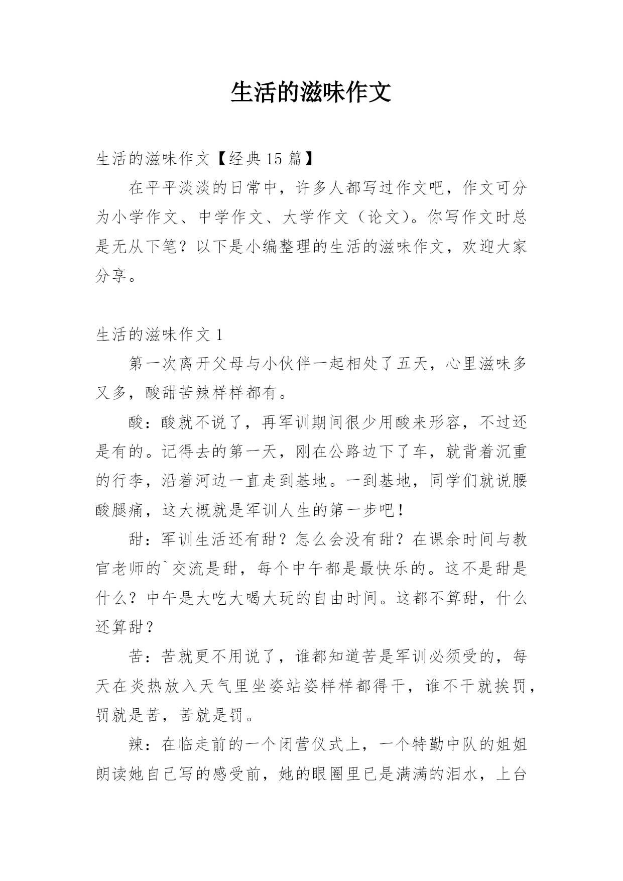 生活的滋味作文生活的滋味作文【经典15篇】在平平淡淡的日常中,许多人都写过作文吧,作文可分为小学作文、中学作文、大学作文(论文)。你写作文时总是无从下笔?以下是小编整理的生活的滋味作文,欢迎大家分享。生活的滋味作文1第一次离开父母与小伙伴一起相处了五天,心里滋味多又多,酸甜苦辣样样都有。酸:酸就不说了,再军训期间很少用酸来形容,不过还是有的。记得去的第一天,刚在公路边下了车,就背着沉重的行李,沿着河边一直走到基地。一到基地,同学们就说腰酸腿痛,这大概就是军训人生的第一步吧!甜:军训生活还有甜?怎么会没有甜