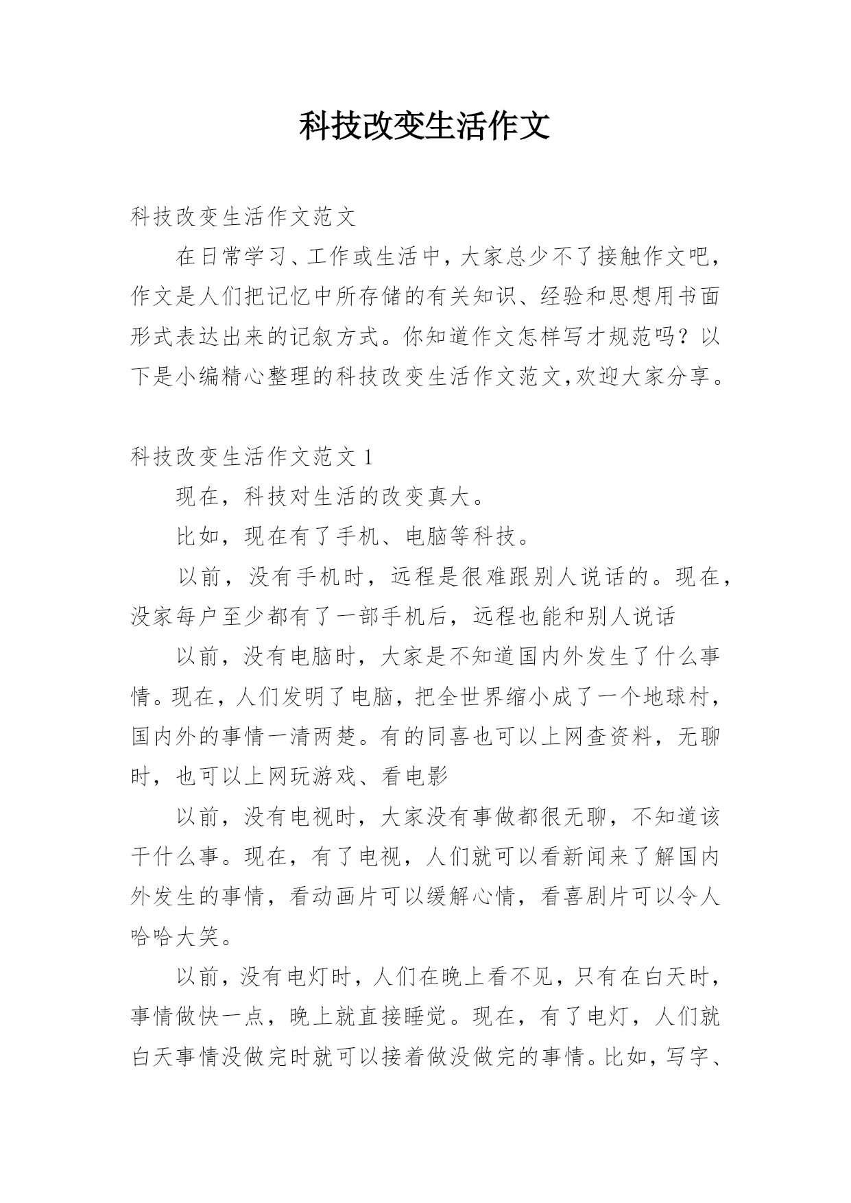 科技改变生活作文科技改变生活作文范文在日常学习、工作或生活中,大家总少不了接触作文吧,作文是人们把记忆中所存储的有关知识、经验和思想用书面形式表达出来的记叙方式。你知道作文怎样写才规范吗?以下是小编精心整理的科技改变生活作文范文,欢迎大家分享。科技改变生活作文范文1现在,科技对生活的改变真大。比如,现在有了手机、电脑等科技。以前,没有手机时,远程是很难跟别人说话的。现在,没家每户至少都有了一部手机后,远程也能和别人说话以前,没有电脑时,大家是不知道国内外发生了什么事情。现在,人们发明了电脑,把全世界缩小成