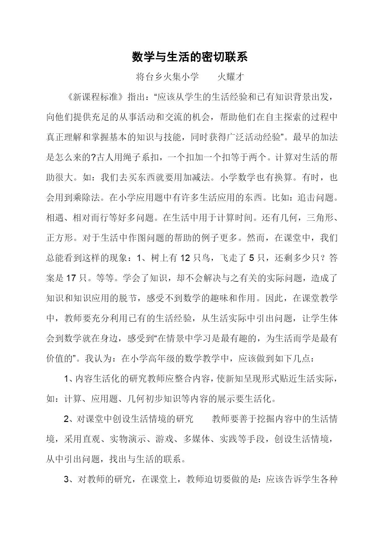 数学与生活的密切联系将台乡火集小学火耀才《新课程标准》指出:“应该从学生的生活经验和已有知识背景出发,向他们提供充足的从事活动和交流的机会,帮助他们在自主探索的过程中真正理解和掌握基本的知识与技能,同时获得广泛活动经验”。最早的加法是怎么来的?古人用绳子系扣,一个扣加一个扣等于两个。计算对生活的帮助很大。如:我们去买东西就要用加减法。小学数学也有换算。有时,也会用到乘除法。在小学应用题中有许多生活应用的东西。比如:追击问题。相遇、相对而行等好多问题。在生活中用于计算时间。还有几何,三角形、正方形。对于生活