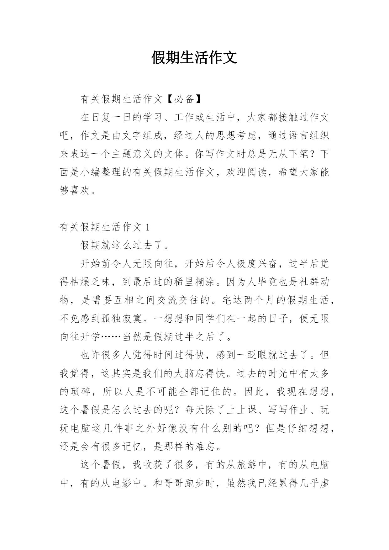 假期生活作文有关假期生活作文【必备】在日复一日的学习、工作或生活中,大家都接触过作文吧,作文是由文字组成,经过人的思想考虑,通过语言组织来表达一个主题意义的文体。你写作文时总是无从下笔?下面是小编整理的有关假期生活作文,欢迎阅读,希望大家能够喜欢。有关假期生活作文1假期就这么过去了。开始前令人无限向往,开始后令人极度兴奋,过半后觉得枯燥乏味,到最后过的稀里糊涂。因为人毕竟也是社群动物,是需要互相之间交流交往的。宅达两个月的假期生活,不免感到孤独寂寞。一想想和同学们在一起的日子,便无限向往开学……当然是假期