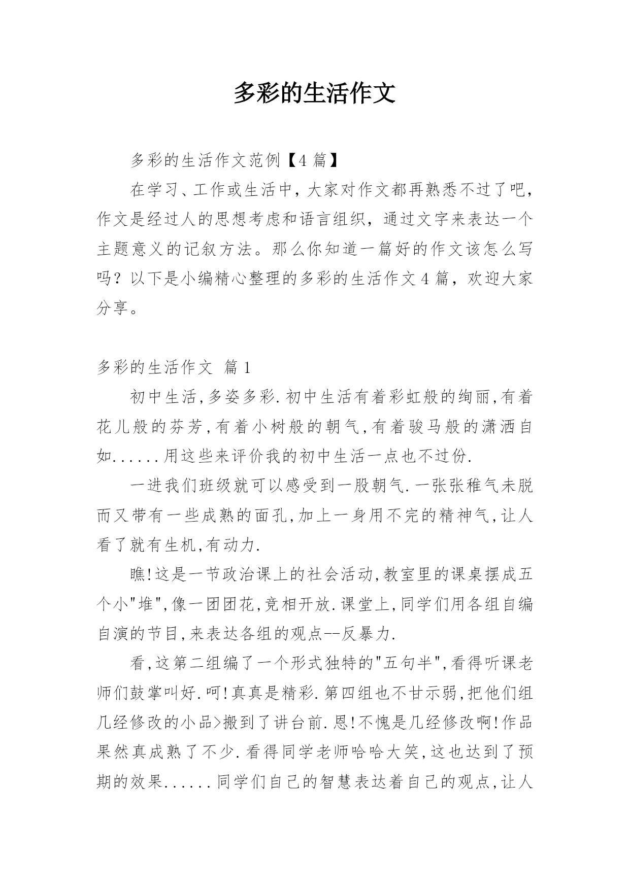 多彩的生活作文多彩的生活作文范例【4篇】在学习、工作或生活中,大家对作文都再熟悉不过了吧,作文是经过人的思想考虑和语言组织,通过文字来表达一个主题意义的记叙方法。那么你知道一篇好的作文该怎么写吗?以下是小编精心整理的多彩的生活作文4篇,欢迎大家分享。多彩的生活作文篇1初中生活,多姿多彩.初中生活有着彩虹般的绚丽,有着花儿般的芬芳,有着小树般的朝气,有着骏马般的潇洒自如......用这些来评价我的初中生活一点也不过份.一进我们班级就可以感受到一股朝气.一张张稚气未脱而又带有一些成熟的面孔,加上一身用不完的精
