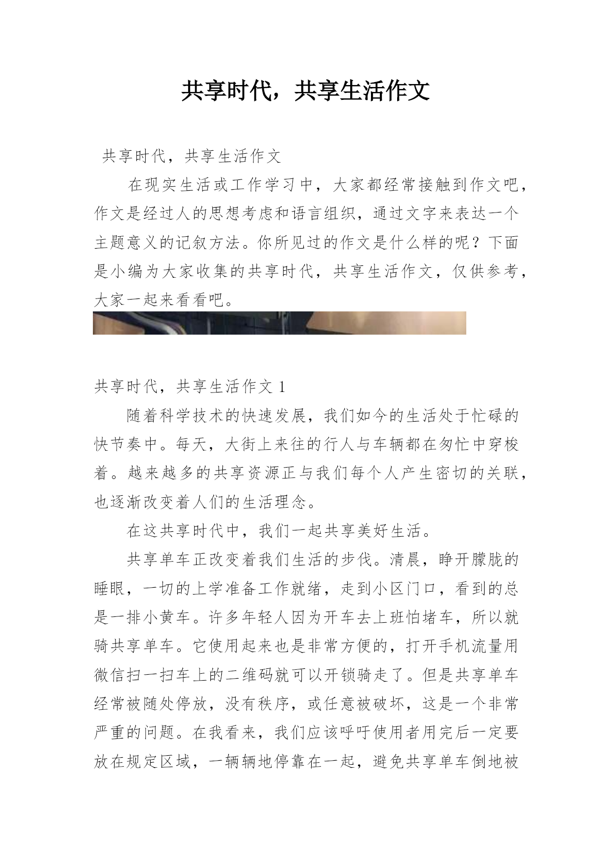 共享时代,共享生活作文共享时代,共享生活作文在现实生活或工作学习中,大家都经常接触到作文吧,作文是经过人的思想考虑和语言组织,通过文字来表达一个主题意义的记叙方法。你所见过的作文是什么样的呢?下面是小编为大家收集的共享时代,共享生活作文,仅供参考,大家一起来看看吧。共享时代,共享生活作文1随着科学技术的快速发展,我们如今的生活处于忙碌的快节奏中。每天,大街上来往的行人与车辆都在匆忙中穿梭着。越来越多的共享资源正与我们每个人产生密切的关联,也逐渐改变着人们的生活理念。在这共享时代中,我们一起共享美好生活。共