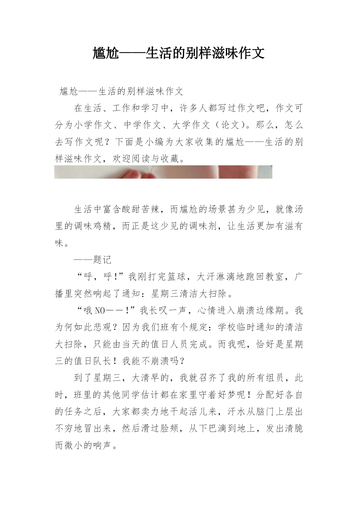 尴尬——生活的别样滋味作文尴尬——生活的别样滋味作文在生活、工作和学习中,许多人都写过作文吧,作文可分为小学作文、中学作文、大学作文(论文)。那么,怎么去写作文呢?下面是小编为大家收集的尴尬——生活的别样滋味作文,欢迎阅读与收藏。生活中富含酸甜苦辣,而尴尬的场景甚为少见,就像汤里的调味鸡精,而正是这少见的调味剂,让生活更加有滋有味。——题记“呼,呼!”我刚打完篮球,大汗淋漓地跑回教室,广播里突然响起了通知:星期三清洁大扫除。“哦NO--!”我长叹一声,心情进入崩溃边缘期。我为何如此悲观?因为我们班有个规定
