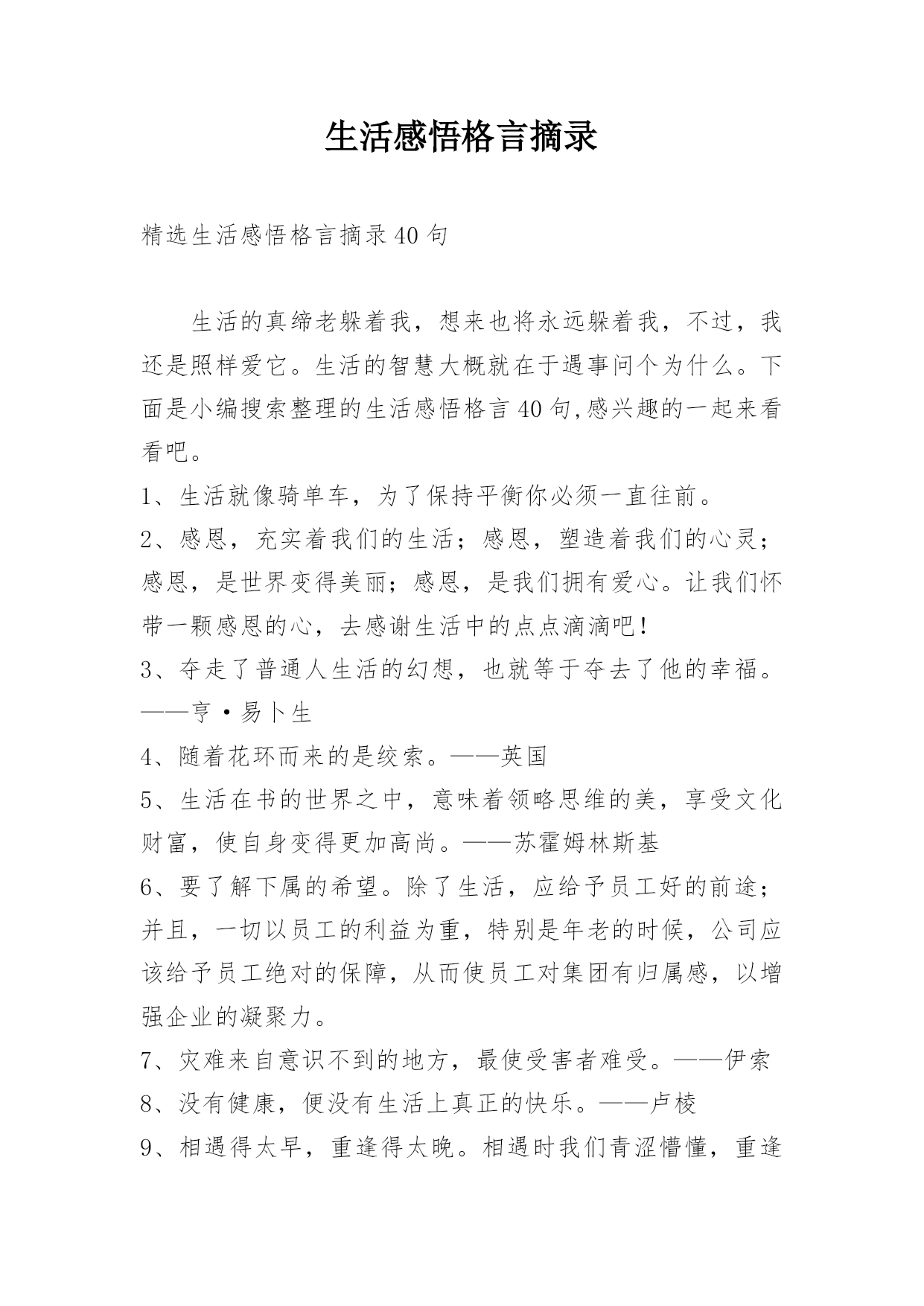 生活感悟格言摘录精选生活感悟格言摘录40句生活的真缔老躲着我,想来也将永远躲着我,不过,我还是照样爱它。生活的智慧大概就在于遇事问个为什么。下面是小编搜索整理的生活感悟格言40句,感兴趣的一起来看看吧。1、生活就像骑单车,为了保持平衡你必须一直往前。2、感恩,充实着我们的生活;感恩,塑造着我们的心灵;感恩,是世界变得美丽;感恩,是我们拥有爱心。让我们怀带一颗感恩的心,去感谢生活中的点点滴滴吧!3、夺走了普通人生活的幻想,也就等于夺去了他的幸福。——亨·易卜生4、随着花环而来的是绞索。——英国5、生活在书的
