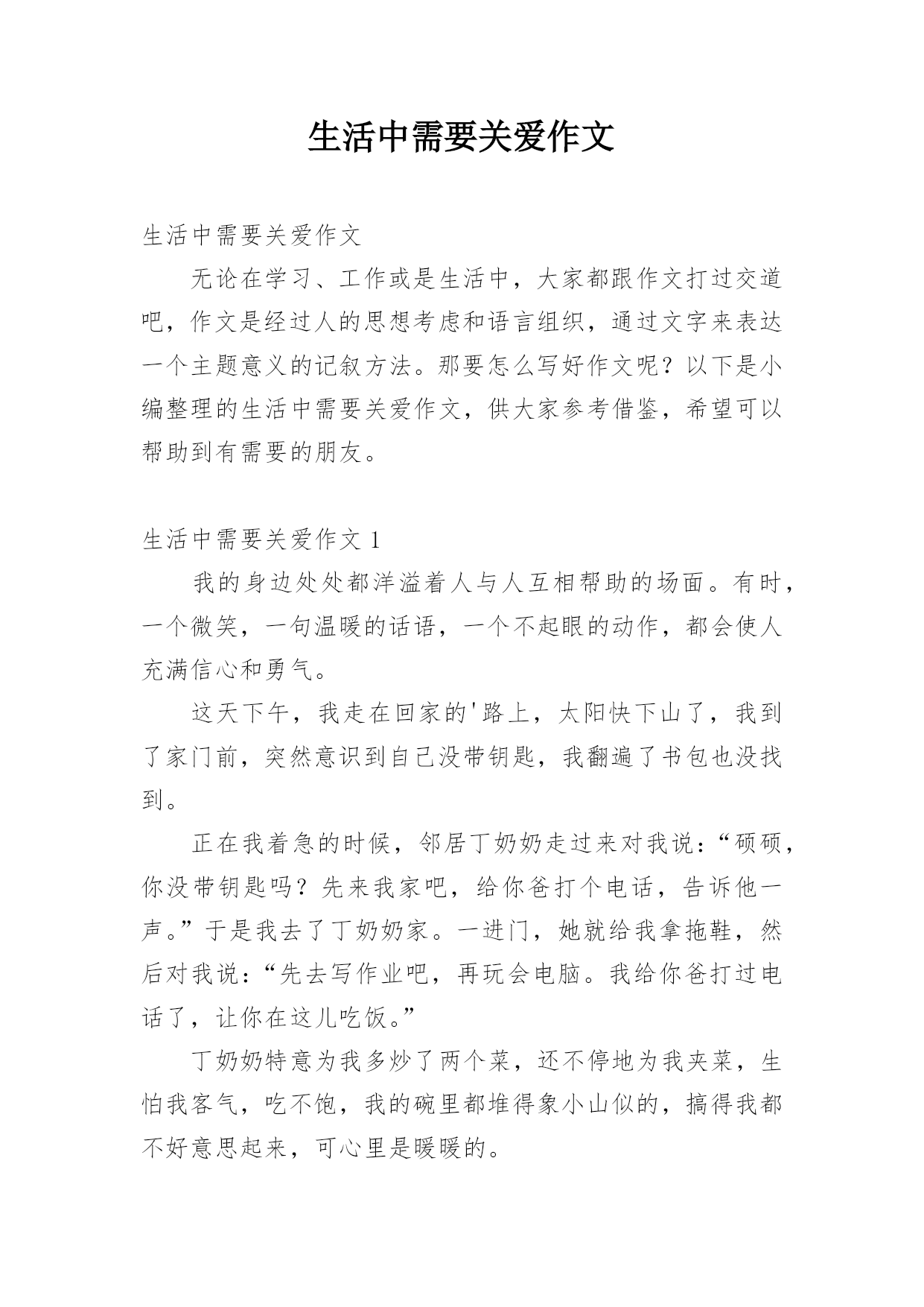 生活中需要关爱作文生活中需要关爱作文无论在学习、工作或是生活中,大家都跟作文打过交道吧,作文是经过人的思想考虑和语言组织,通过文字来表达一个主题意义的记叙方法。那要怎么写好作文呢?以下是小编整理的生活中需要关爱作文,供大家参考借鉴,希望可以帮助到有需要的朋友。生活中需要关爱作文1我的身边处处都洋溢着人与人互相帮助的场面。有时,一个微笑,一句温暖的话语,一个不起眼的动作,都会使人充满信心和勇气。这天下午,我走在回家的'路上,太阳快下山了,我到了家门前,突然意识到自己没带钥匙,我翻遍了书包也没找到。正在我着急