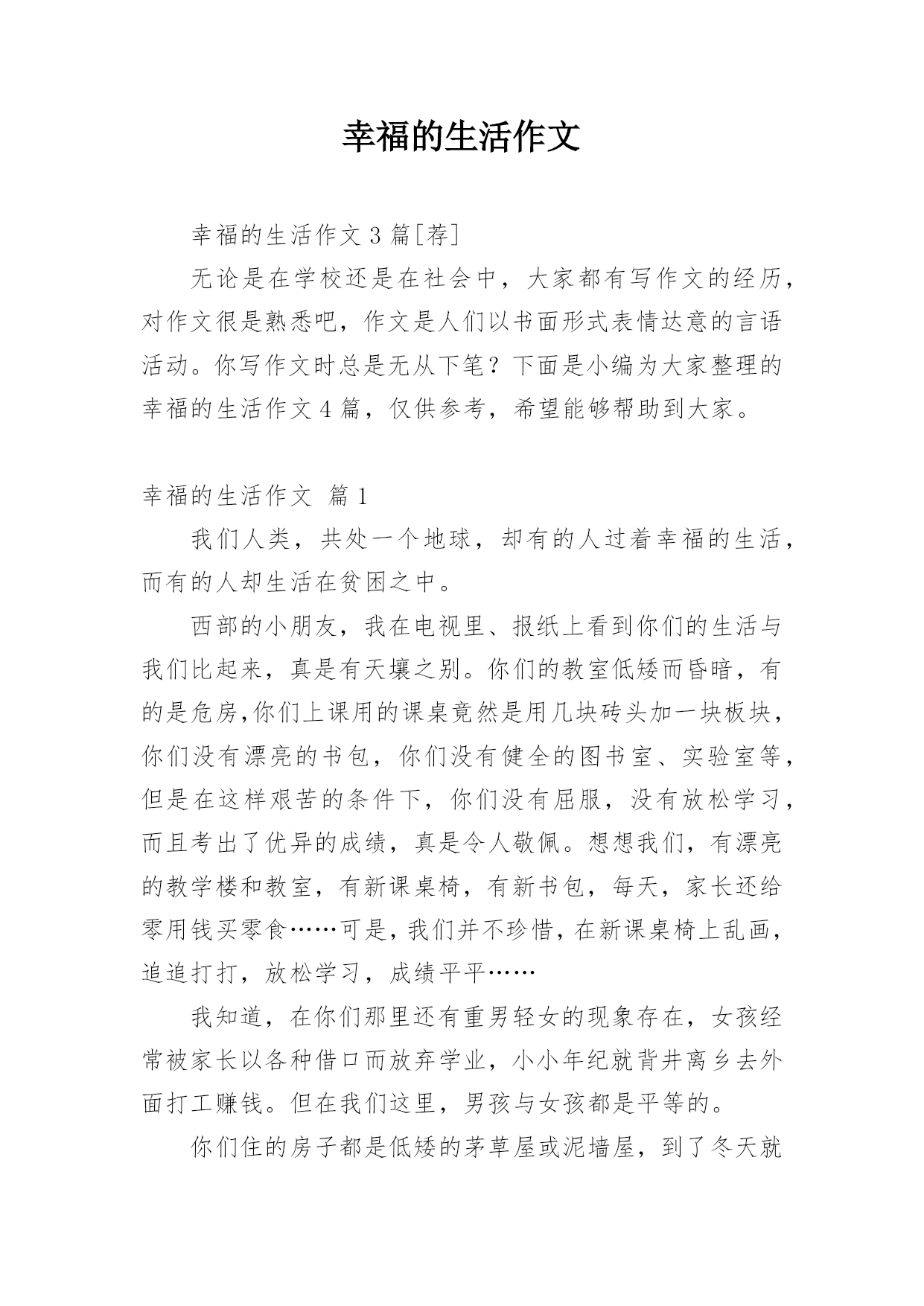 幸福的生活作文幸福的生活作文3篇[荐]无论是在学校还是在社会中,大家都有写作文的经历,对作文很是熟悉吧,作文是人们以书面形式表情达意的言语活动。你写作文时总是无从下笔?下面是小编为大家整理的幸福的生活作文4篇,仅供参考,希望能够帮助到大家。幸福的生活作文篇1我们人类,共处一个地球,却有的人过着幸福的生活,而有的人却生活在贫困之中。西部的小朋友,我在电视里、报纸上看到你们的生活与我们比起来,真是有天壤之别。你们的教室低矮而昏暗,有的是危房,你们上课用的课桌竟然是用几块砖头加一块板块,你们没有漂亮的书包,你们