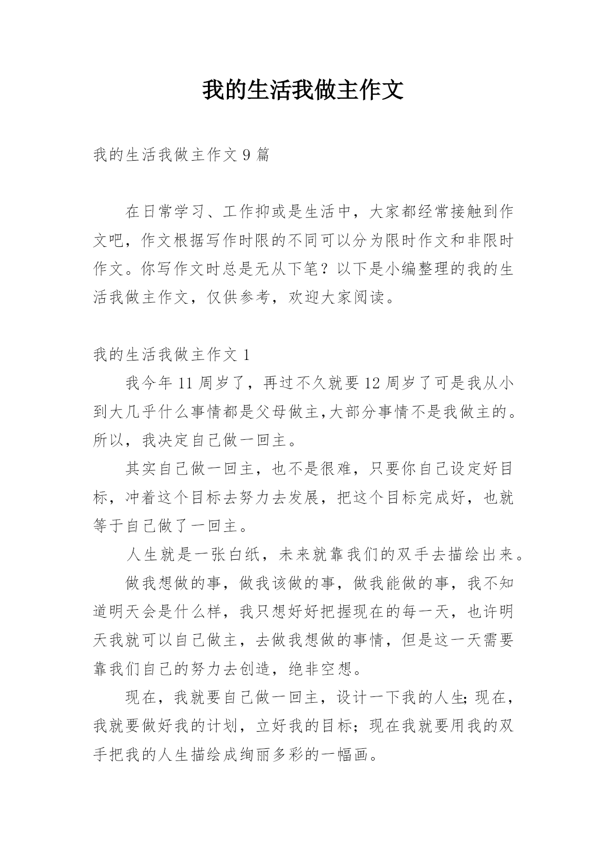 我的生活我做主作文我的生活我做主作文9篇在日常学习、工作抑或是生活中,大家都经常接触到作文吧,作文根据写作时限的不同可以分为限时作文和非限时作文。你写作文时总是无从下笔?以下是小编整理的我的生活我做主作文,仅供参考,欢迎大家阅读。我的生活我做主作文1我今年11周岁了,再过不久就要12周岁了可是我从小到大几乎什么事情都是父母做主,大部分事情不是我做主的。所以,我决定自己做一回主。其实自己做一回主,也不是很难,只要你自己设定好目标,冲着这个目标去努力去发展,把这个目标完成好,也就等于自己做了一回主。人生就是一
