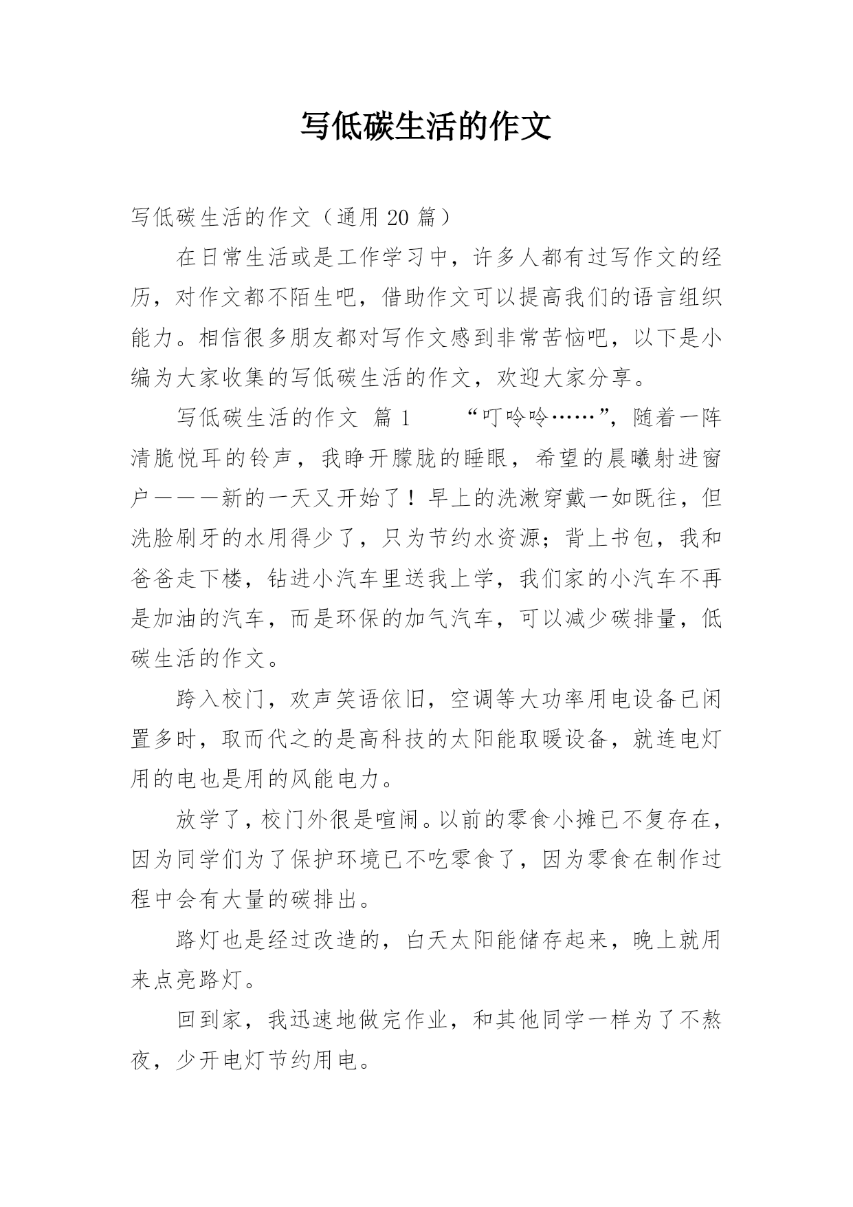 写低碳生活的作文写低碳生活的作文(通用20篇)在日常生活或是工作学习中,许多人都有过写作文的经历,对作文都不陌生吧,借助作文可以提高我们的语言组织能力。相信很多朋友都对写作文感到非常苦恼吧,以下是小编为大家收集的写低碳生活的作文,欢迎大家分享。写低碳生活的作文篇1“叮呤呤……”,随着一阵清脆悦耳的铃声,我睁开朦胧的睡眼,希望的晨曦射进窗户―――新的一天又开始了!早上的洗漱穿戴一如既往,但洗脸刷牙的水用得少了,只为节约水资源;背上书包,我和爸爸走下楼,钻进小汽车里送我上学,我们家的小汽车不再是加油的汽车,而