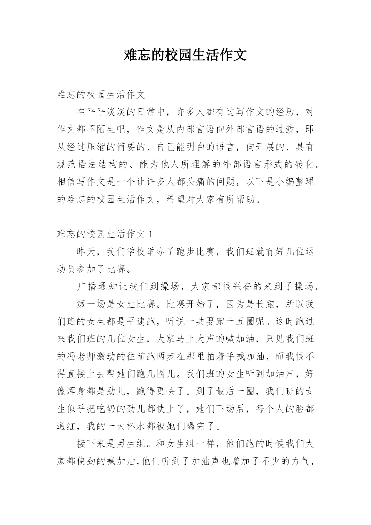 难忘的校园生活作文难忘的校园生活作文在平平淡淡的日常中,许多人都有过写作文的经历,对作文都不陌生吧,作文是从内部言语向外部言语的过渡,即从经过压缩的简要的、自己能明白的语言,向开展的、具有规范语法结构的、能为他人所理解的外部语言形式的转化。相信写作文是一个让许多人都头痛的问题,以下是小编整理的难忘的校园生活作文,希望对大家有所帮助。难忘的校园生活作文1昨天,我们学校举办了跑步比赛,我们班就有好几位运动员参加了比赛。广播通知让我们到操场,大家都很兴奋的来到了操场。第一场是女生比赛。比赛开始了,因为是长跑,所