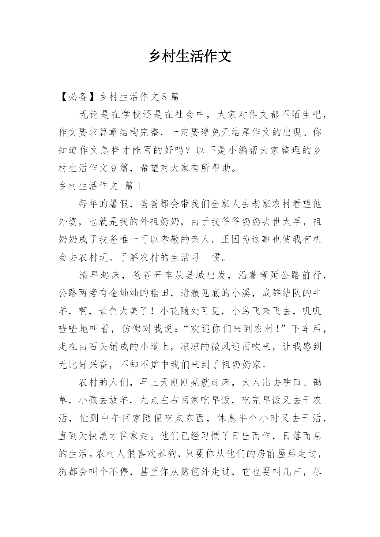 乡村生活作文【必备】乡村生活作文8篇无论是在学校还是在社会中,大家对作文都不陌生吧,作文要求篇章结构完整,一定要避免无结尾作文的出现。你知道作文怎样才能写的好吗?以下是小编帮大家整理的乡村生活作文9篇,希望对大家有所帮助。乡村生活作文篇1每年的暑假,爸爸都会带我们全家人去老家农村看望他外婆,也就是我的外祖奶奶,由于我爷爷奶奶去世太早,祖奶奶成了我爸唯一可以孝敬的亲人。正因为这事也使我有机会去农村玩。了解农村的生活习惯。清早起床,爸爸开车从县城出发,沿着弯延公路前行,公路两旁有金灿灿的稻田,清澈见底的小溪,