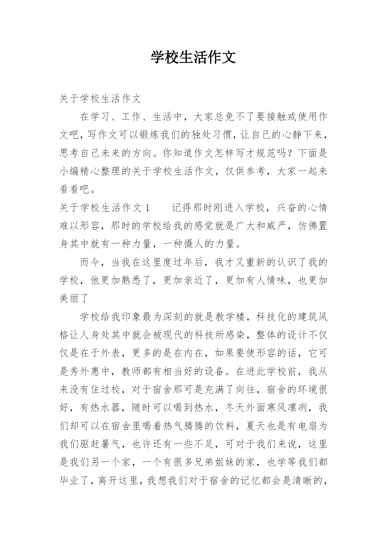 学校生活作文关于学校生活作文在学习、工作、生活中,大家总免不了要接触或使用作文吧,写作文可以锻炼我们的独处习惯,让自己的心静下来,思考自己未来的方向。你知道作文怎样写才规范吗?下面是小编精心整理的关于学校生活作文,仅供参考,大家一起来看看吧。关于学校生活作文1记得那时刚进入学校,兴奋的心情难以形容,那时的学校给我的感觉就是广大和威严,仿佛置身其中就有一种力量,一种慑人的力量。而今,当我在这里度过年后,我才又重新的认识了我的学校,他更加熟悉了,更加亲近了,更加有人情味,也更加美丽了学校给我印象最为深刻的就是