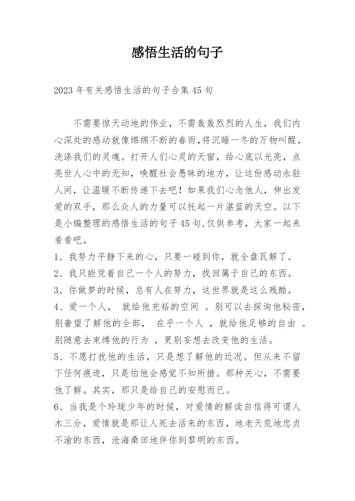 感悟生活的句子2023年有关感悟生活的句子合集45句不需要惊天动地的伟业,不需轰轰烈烈的人生,我们内心深处的感动就像绵绵不断的春雨,将沉睡一冬的万物叫醒,洗涤我们的灵魂。打开人们心灵的天窗,给心底以光亮,点亮世人心中的无知,唤醒社会愚昧的地方,让这份感动永驻人间,让温暖不断传递下去吧!如果我们心念他人,伸出发爱的双手,那么众人的力量可以托起一片湛蓝的天空。以下是小编整理的感悟生活的句子45句,仅供参考,大家一起来看看吧。1、我努力平静下来的心,只要一碰到你,就全盘瓦解了。2、我只能凭着自己一个人的努力,找
