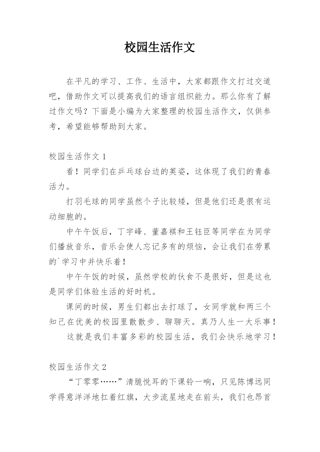 校园生活作文在平凡的学习、工作、生活中,大家都跟作文打过交道吧,借助作文可以提高我们的语言组织能力。那么你有了解过作文吗?下面是小编为大家整理的校园生活作文,仅供参考,希望能够帮助到大家。校园生活作文1看!同学们在乒乓球台边的英姿,这体现了我们的青春活力。打羽毛球的同学虽然个子比较矮,但是他们还是很有运动细胞的。中午午饭后,丁宇峰、董嘉褀和王钰臣等同学在为同学们播放音乐,音乐会使人忘记多有的烦恼,会让我们在劳累的`学习中并快乐着!中午午饭的时候,虽然学校的伙食不是很好,但是这也是同学们体验生活的好时机。课