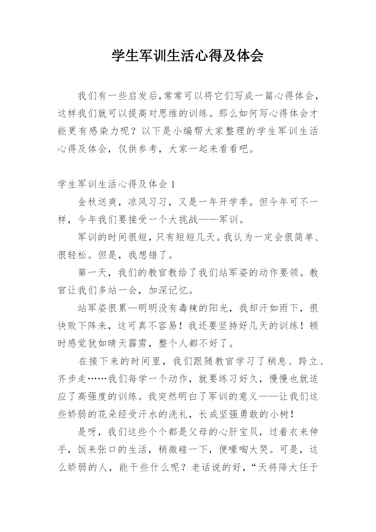 学生军训生活心得及体会我们有一些启发后,常常可以将它们写成一篇心得体会,这样我们就可以提高对思维的训练。那么如何写心得体会才能更有感染力呢?以下是小编帮大家整理的学生军训生活心得及体会,仅供参考,大家一起来看看吧。学生军训生活心得及体会1金秋送爽,凉风习习,又是一年开学季。但今年可不一样,今年我们要接受一个大挑战——军训。军训的时间很短,只有短短几天。我认为一定会很简单、很轻松。但是,我想错了。第一天,我们的教官教给了我们站军姿的动作要领。教官让我们多站一会,加深记忆。站军姿很累—明明没有毒辣的阳光,我却
