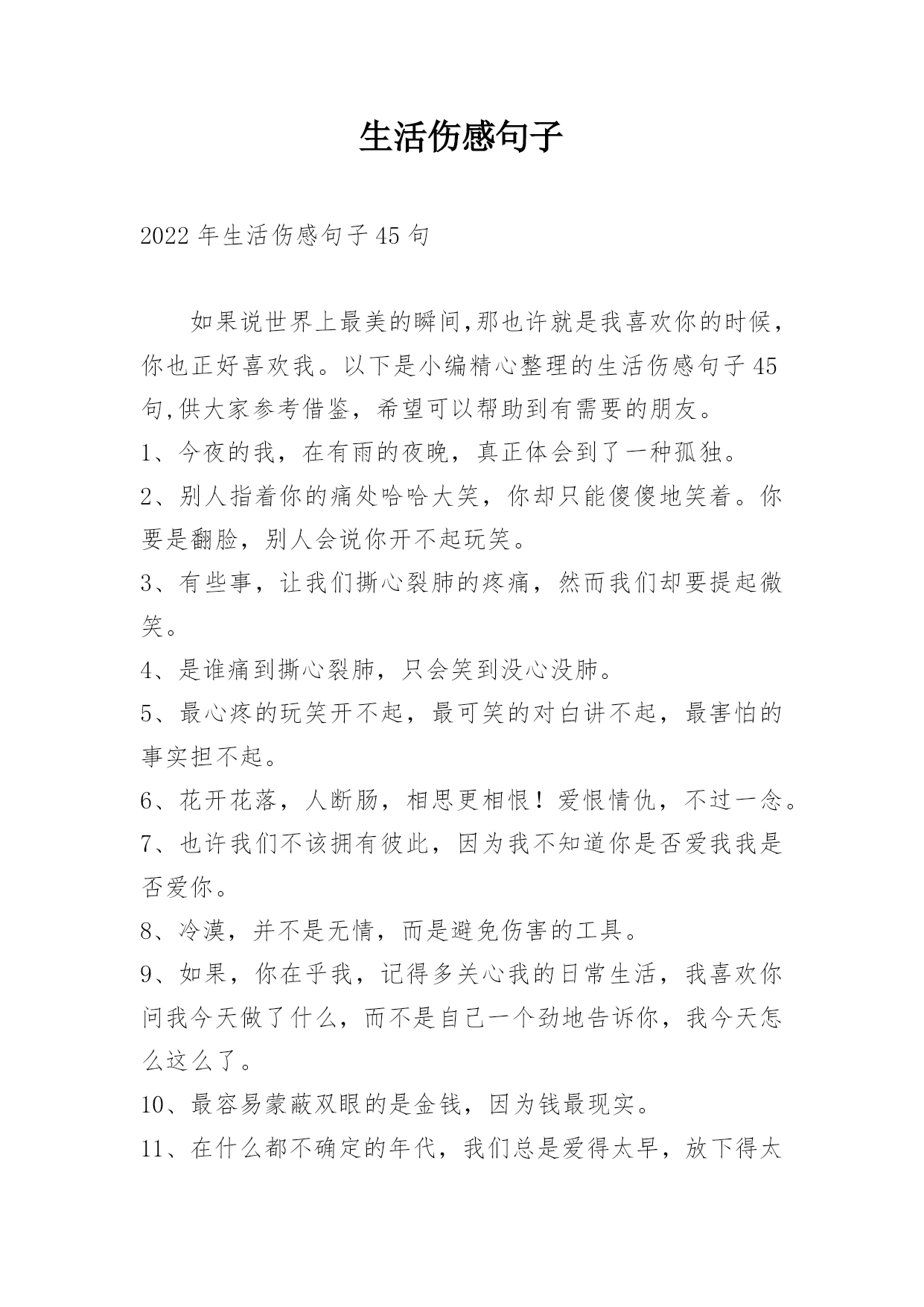 生活伤感句子2022年生活伤感句子45句如果说世界上最美的瞬间,那也许就是我喜欢你的时候,你也正好喜欢我。以下是小编精心整理的生活伤感句子45句,供大家参考借鉴,希望可以帮助到有需要的朋友。1、今夜的我,在有雨的夜晚,真正体会到了一种孤独。2、别人指着你的痛处哈哈大笑,你却只能傻傻地笑着。你要是翻脸,别人会说你开不起玩笑。3、有些事,让我们撕心裂肺的疼痛,然而我们却要提起微笑。4、是谁痛到撕心裂肺,只会笑到没心没肺。5、最心疼的玩笑开不起,最可笑的对白讲不起,最害怕的事实担不起。6、花开花落,人断肠,相思