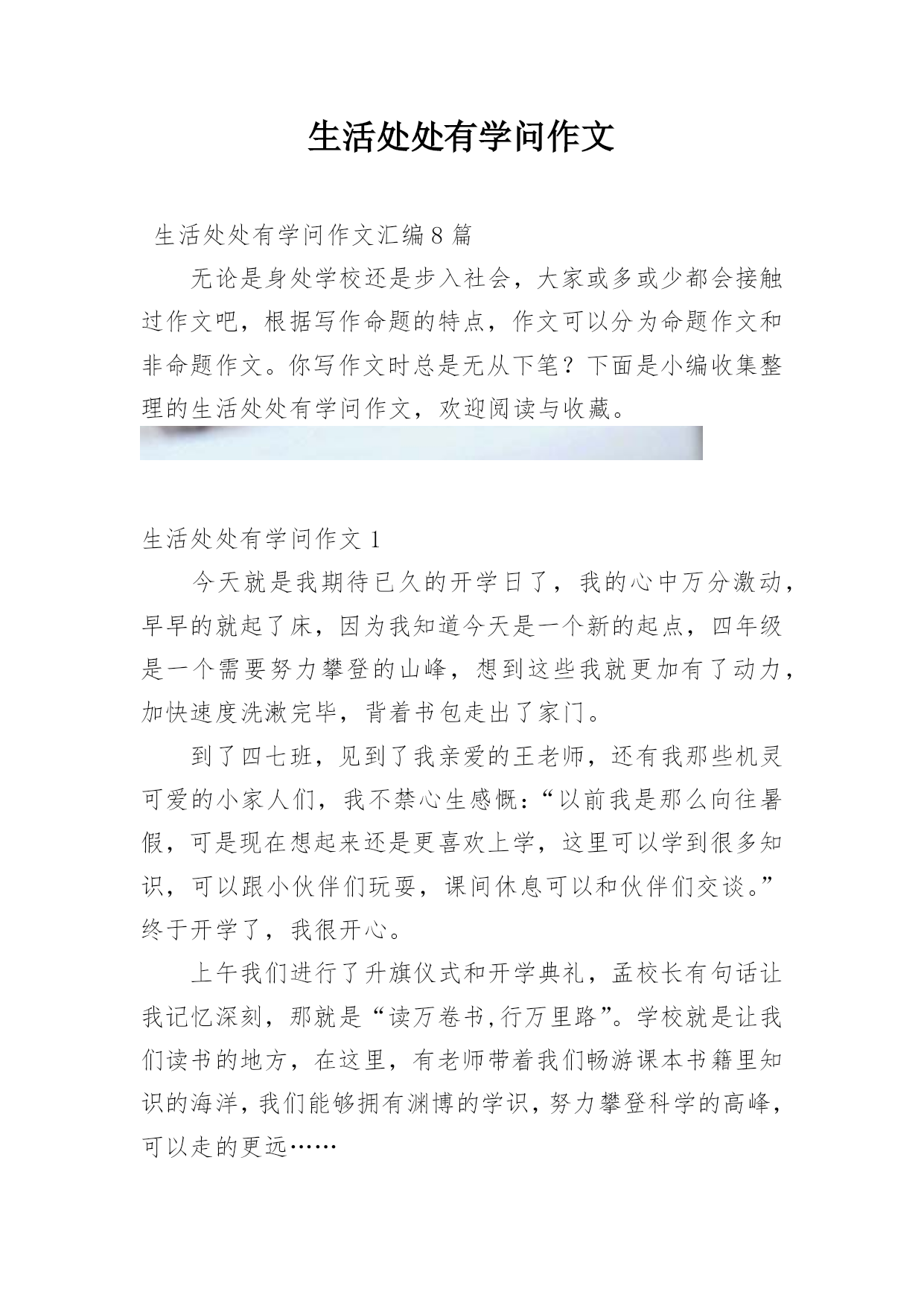 生活处处有学问作文生活处处有学问作文汇编8篇无论是身处学校还是步入社会,大家或多或少都会接触过作文吧,根据写作命题的特点,作文可以分为命题作文和非命题作文。你写作文时总是无从下笔?下面是小编收集整理的生活处处有学问作文,欢迎阅读与收藏。生活处处有学问作文1今天就是我期待已久的开学日了,我的心中万分激动,早早的就起了床,因为我知道今天是一个新的起点,四年级是一个需要努力攀登的山峰,想到这些我就更加有了动力,加快速度洗漱完毕,背着书包走出了家门。到了四七班,见到了我亲爱的王老师,还有我那些机灵可爱的小家人们,