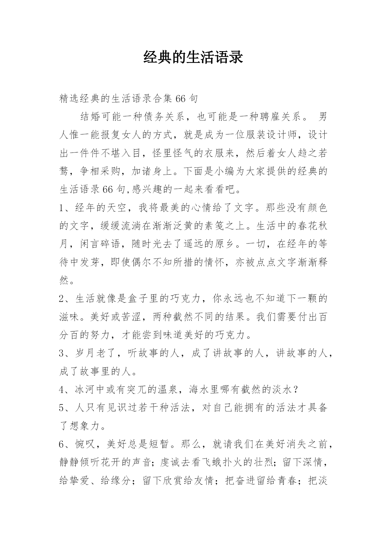 经典的生活语录精选经典的生活语录合集66句结婚可能一种债务关系,也可能是一种聘雇关系。男人惟一能报复女人的方式,就是成为一位服装设计师,设计出一件件不堪入目,怪里怪气的衣服来,然后着女人趋之若鹜,争相采购,加诸身上。下面是小编为大家提供的经典的生活语录66句,感兴趣的一起来看看吧。1、经年的天空,我将最美的心情给了文字。那些没有颜色的文字,缓缓流淌在渐渐泛黄的素笺之上。生活中的春花秋月,闲言碎语,随时光去了遥远的原乡。一切,在经年的等待中发芽,即使偶尔不知所措的情怀,亦被点点文字渐渐释然。2、生活就像是盒
