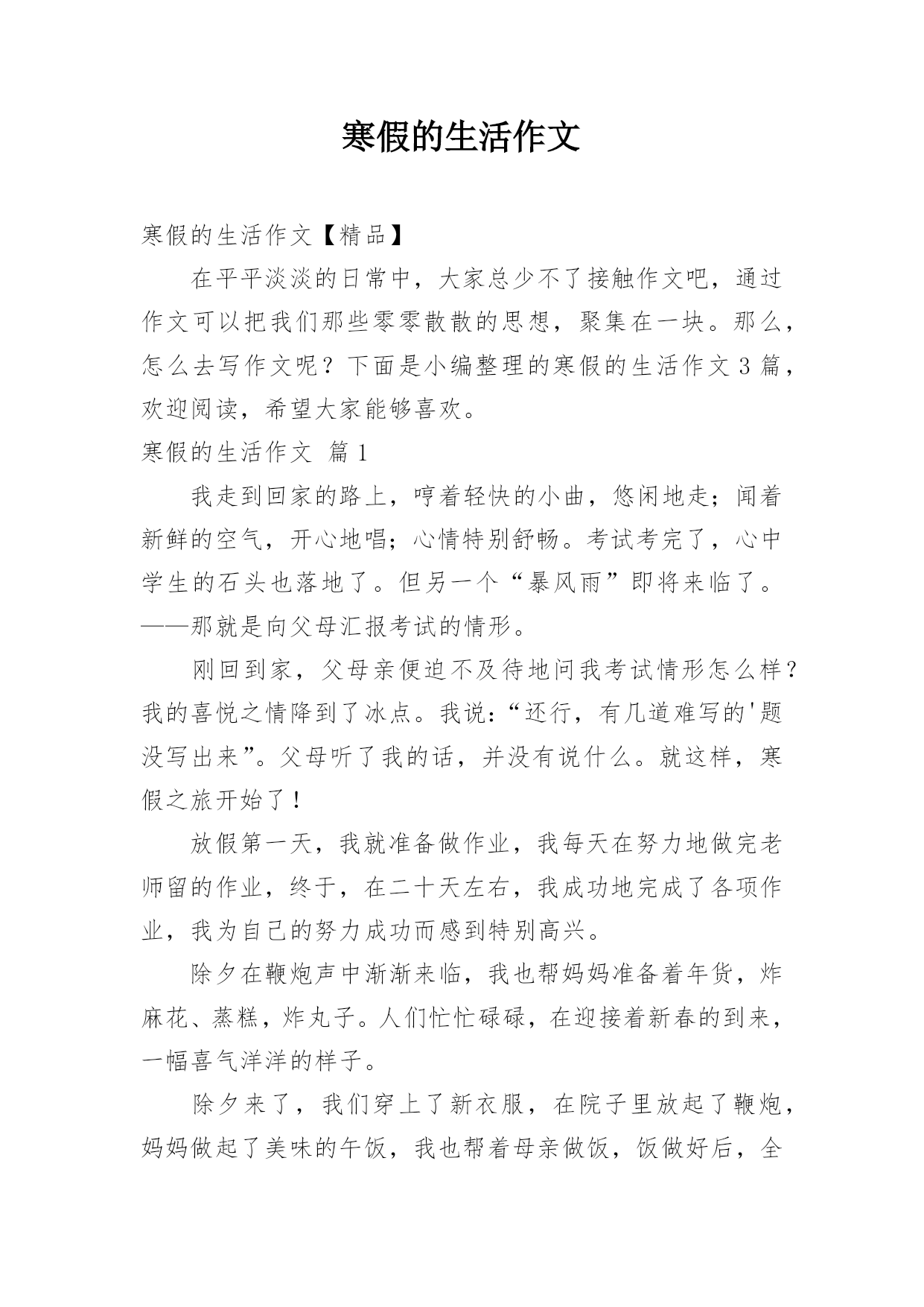 寒假的生活作文寒假的生活作文【精品】在平平淡淡的日常中,大家总少不了接触作文吧,通过作文可以把我们那些零零散散的思想,聚集在一块。那么,怎么去写作文呢?下面是小编整理的寒假的生活作文3篇,欢迎阅读,希望大家能够喜欢。寒假的生活作文篇1我走到回家的路上,哼着轻快的小曲,悠闲地走;闻着新鲜的空气,开心地唱;心情特别舒畅。考试考完了,心中学生的石头也落地了。但另一个“暴风雨”即将来临了。——那就是向父母汇报考试的情形。刚回到家,父母亲便迫不及待地问我考试情形怎么样?我的喜悦之情降到了冰点。我说:“还行,有几道难