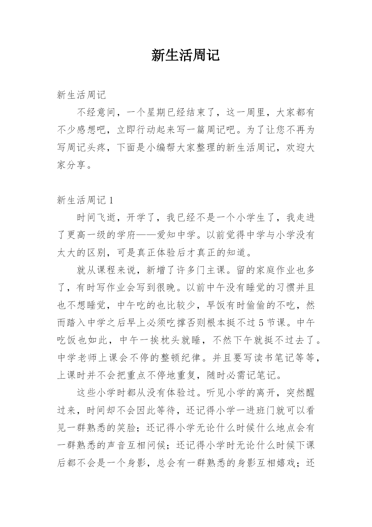 新生活周记新生活周记不经意间,一个星期已经结束了,这一周里,大家都有不少感想吧,立即行动起来写一篇周记吧。为了让您不再为写周记头疼,下面是小编帮大家整理的新生活周记,欢迎大家分享。新生活周记1时间飞逝,开学了,我已经不是一个小学生了,我走进了更高一级的学府——爱知中学。以前觉得中学与小学没有太大的区别,可是真正体验后才真正的知道。就从课程来说,新增了许多门主课。留的家庭作业也多了,有时写作业会写到很晚。以前中午没有睡觉的习惯并且也不想睡觉,中午吃的也比较少,早饭有时偷偷的不吃,然而踏入中学之后早上必须吃撑