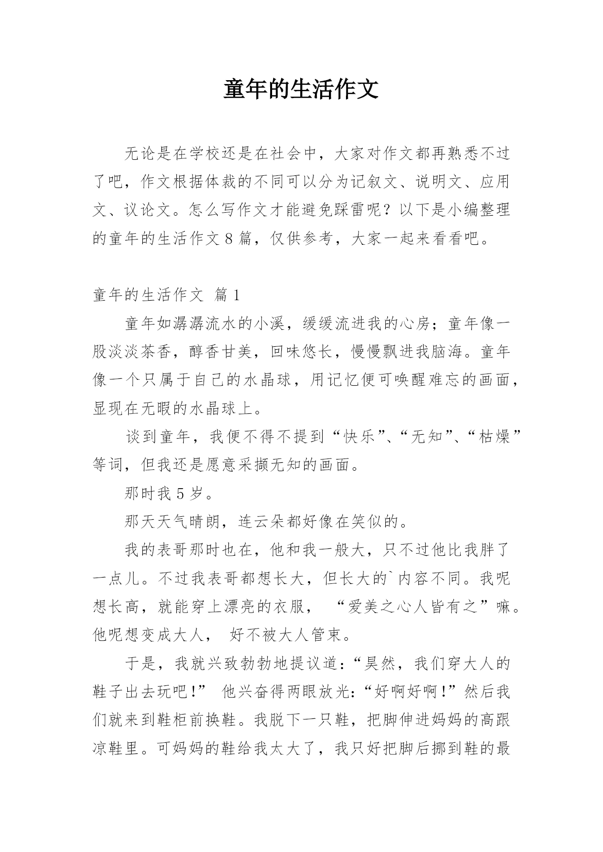 童年的生活作文无论是在学校还是在社会中,大家对作文都再熟悉不过了吧,作文根据体裁的不同可以分为记叙文、说明文、应用文、议论文。怎么写作文才能避免踩雷呢?以下是小编整理的童年的生活作文8篇,仅供参考,大家一起来看看吧。童年的生活作文篇1童年如潺潺流水的小溪,缓缓流进我的心房;童年像一股淡淡茶香,醇香甘美,回味悠长,慢慢飘进我脑海。童年像一个只属于自己的水晶球,用记忆便可唤醒难忘的画面,显现在无暇的水晶球上。谈到童年,我便不得不提到“快乐”、“无知”、“枯燥”等词,但我还是愿意采撷无知的画面。那时我5岁。那天