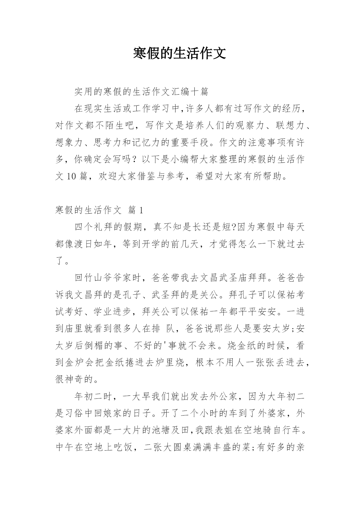 寒假的生活作文实用的寒假的生活作文汇编十篇在现实生活或工作学习中,许多人都有过写作文的经历,对作文都不陌生吧,写作文是培养人们的观察力、联想力、想象力、思考力和记忆力的重要手段。作文的注意事项有许多,你确定会写吗?以下是小编帮大家整理的寒假的生活作文10篇,欢迎大家借鉴与参考,希望对大家有所帮助。寒假的生活作文篇1四个礼拜的假期,真不知是长还是短?因为寒假中每天都像渡日如年,等到开学的前几天,才觉得怎么一下就过去了。回竹山爷爷家时,爸爸带我去文昌武圣庙拜拜。爸爸告诉我文昌拜的是孔子、武圣拜的是关公。拜孔子