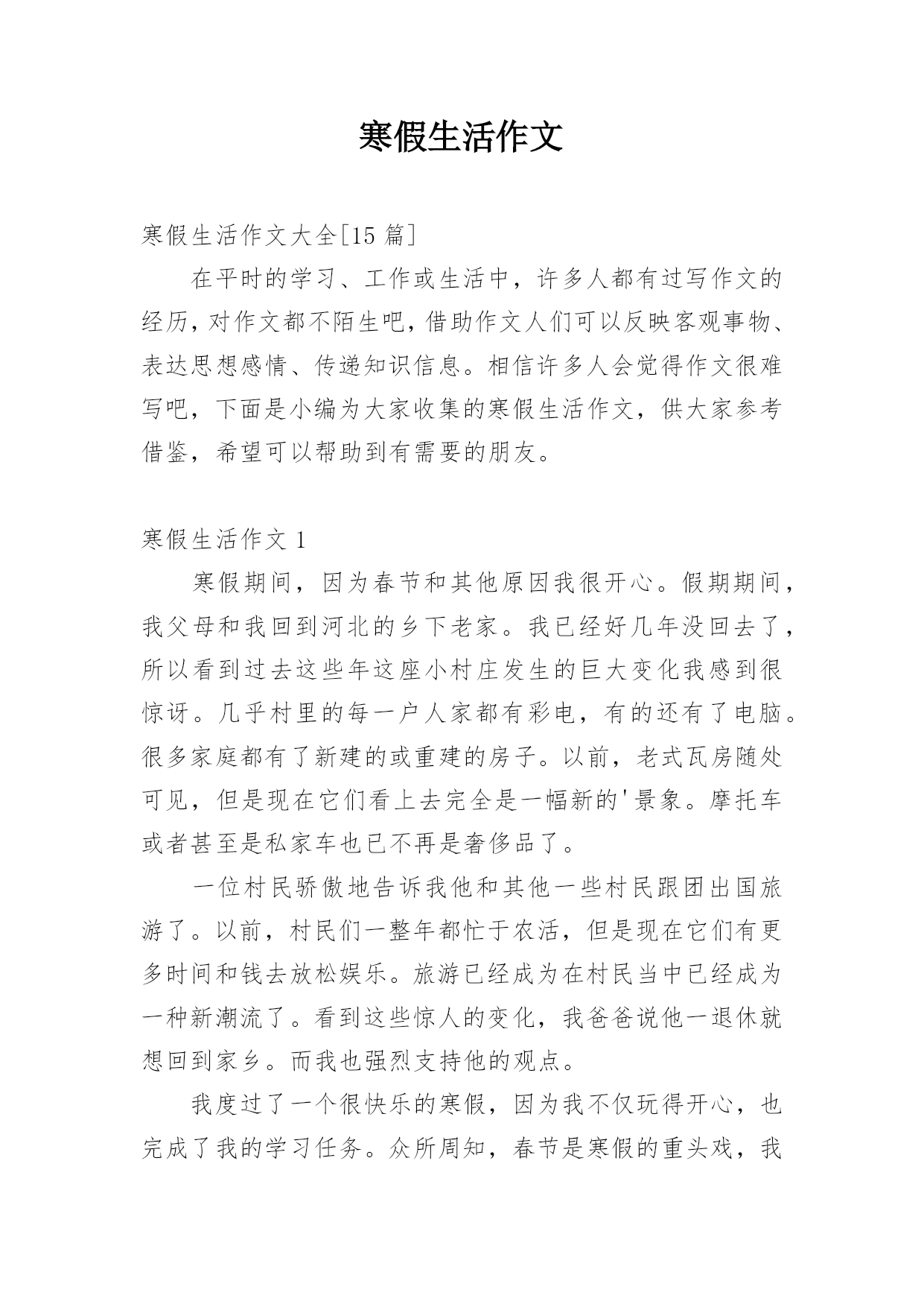 寒假生活作文寒假生活作文大全[15篇]在平时的学习、工作或生活中,许多人都有过写作文的经历,对作文都不陌生吧,借助作文人们可以反映客观事物、表达思想感情、传递知识信息。相信许多人会觉得作文很难写吧,下面是小编为大家收集的寒假生活作文,供大家参考借鉴,希望可以帮助到有需要的朋友。寒假生活作文1寒假期间,因为春节和其他原因我很开心。假期期间,我父母和我回到河北的乡下老家。我已经好几年没回去了,所以看到过去这些年这座小村庄发生的巨大变化我感到很惊讶。几乎村里的每一户人家都有彩电,有的还有了电脑。很多家庭都有了新