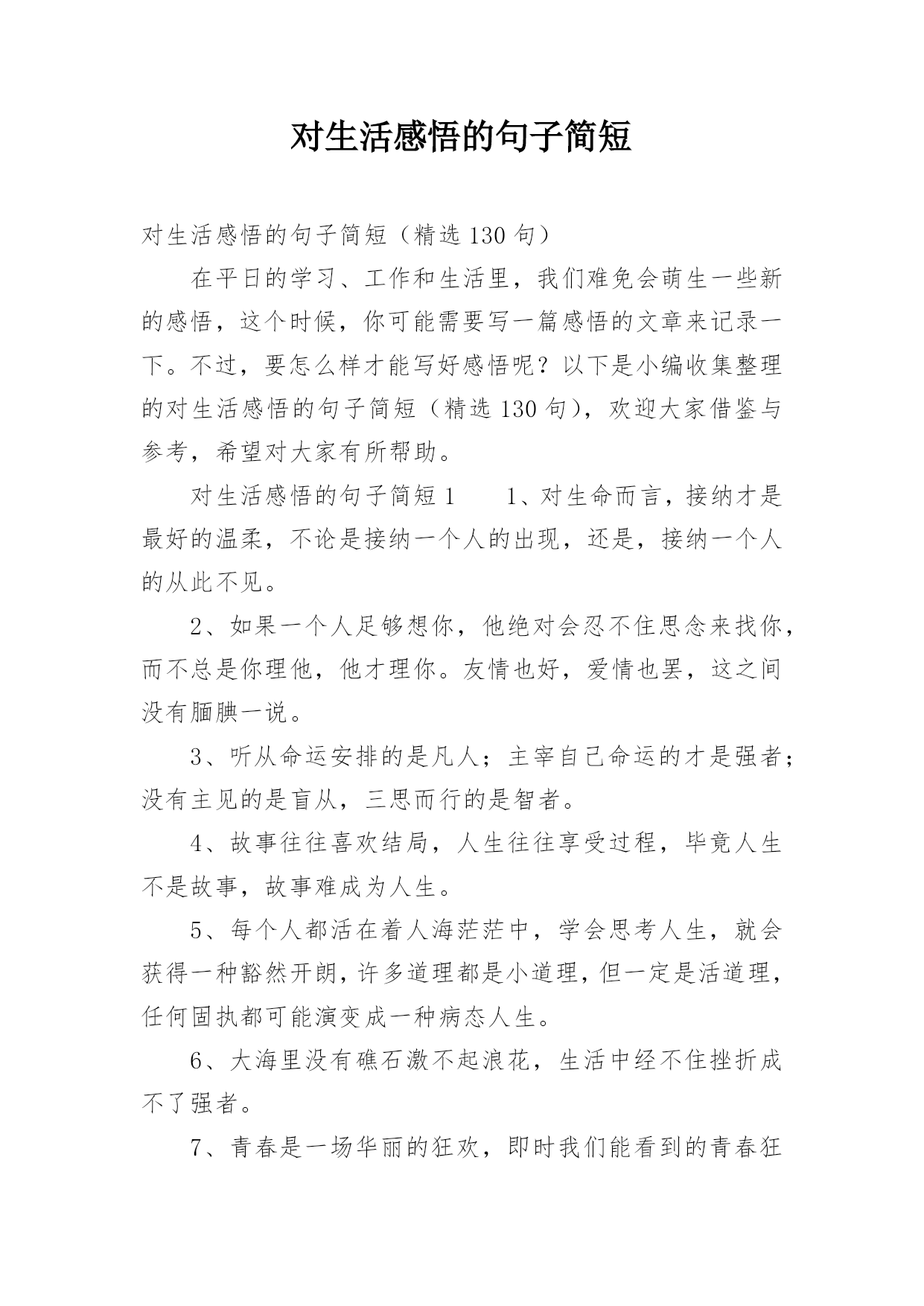 对生活感悟的句子简短对生活感悟的句子简短(精选130句)在平日的学习、工作和生活里,我们难免会萌生一些新的感悟,这个时候,你可能需要写一篇感悟的文章来记录一下。不过,要怎么样才能写好感悟呢?以下是小编收集整理的对生活感悟的句子简短(精选130句),欢迎大家借鉴与参考,希望对大家有所帮助。对生活感悟的句子简短11、对生命而言,接纳才是最好的温柔,不论是接纳一个人的出现,还是,接纳一个人的从此不见。2、如果一个人足够想你,他绝对会忍不住思念来找你,而不总是你理他,他才理你。友情也好,爱情也罢,这之间没有腼腆一
