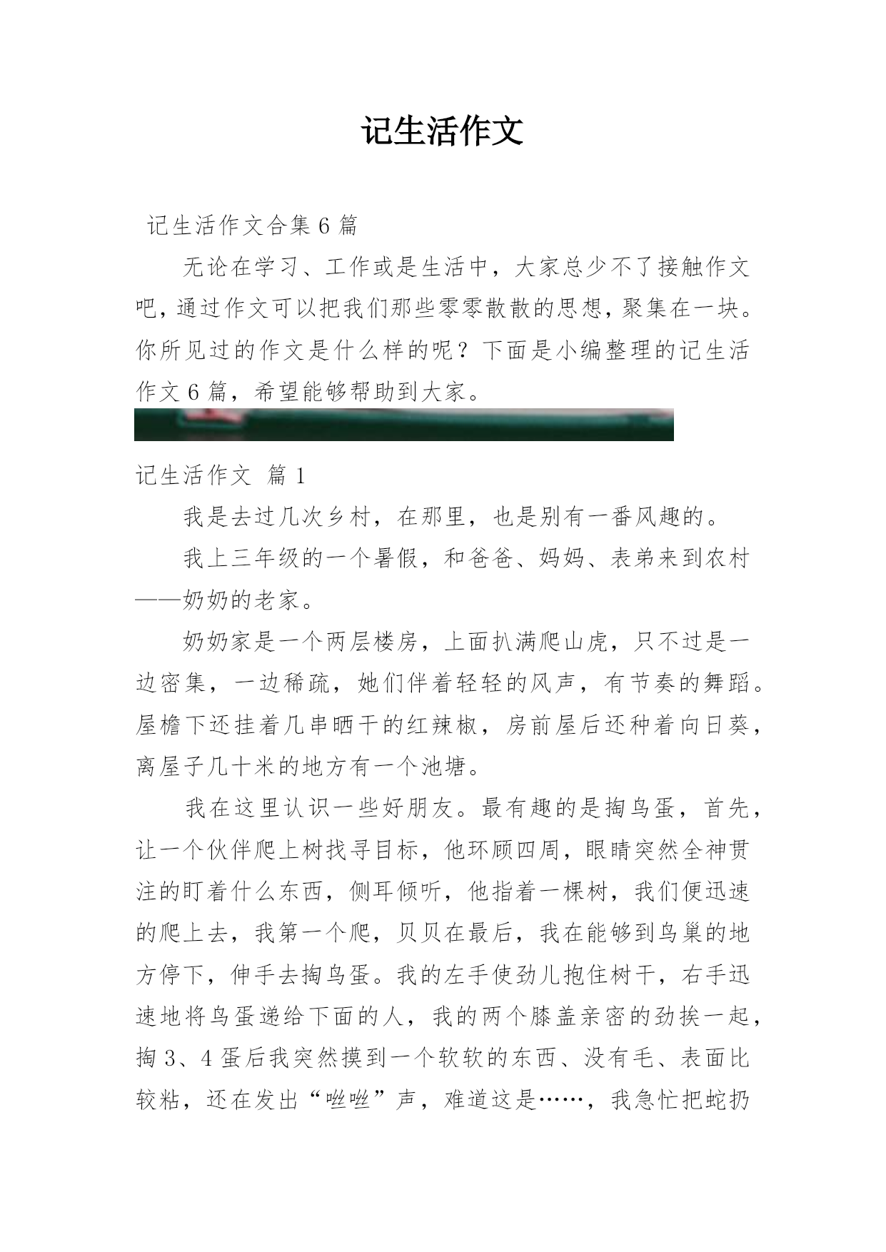 记生活作文记生活作文合集6篇无论在学习、工作或是生活中,大家总少不了接触作文吧,通过作文可以把我们那些零零散散的思想,聚集在一块。你所见过的作文是什么样的呢?下面是小编整理的记生活作文6篇,希望能够帮助到大家。记生活作文篇1我是去过几次乡村,在那里,也是别有一番风趣的。我上三年级的一个暑假,和爸爸、妈妈、表弟来到农村——奶奶的老家。奶奶家是一个两层楼房,上面扒满爬山虎,只不过是一边密集,一边稀疏,她们伴着轻轻的风声,有节奏的舞蹈。屋檐下还挂着几串晒干的红辣椒,房前屋后还种着向日葵,离屋子几十米的地方有一个