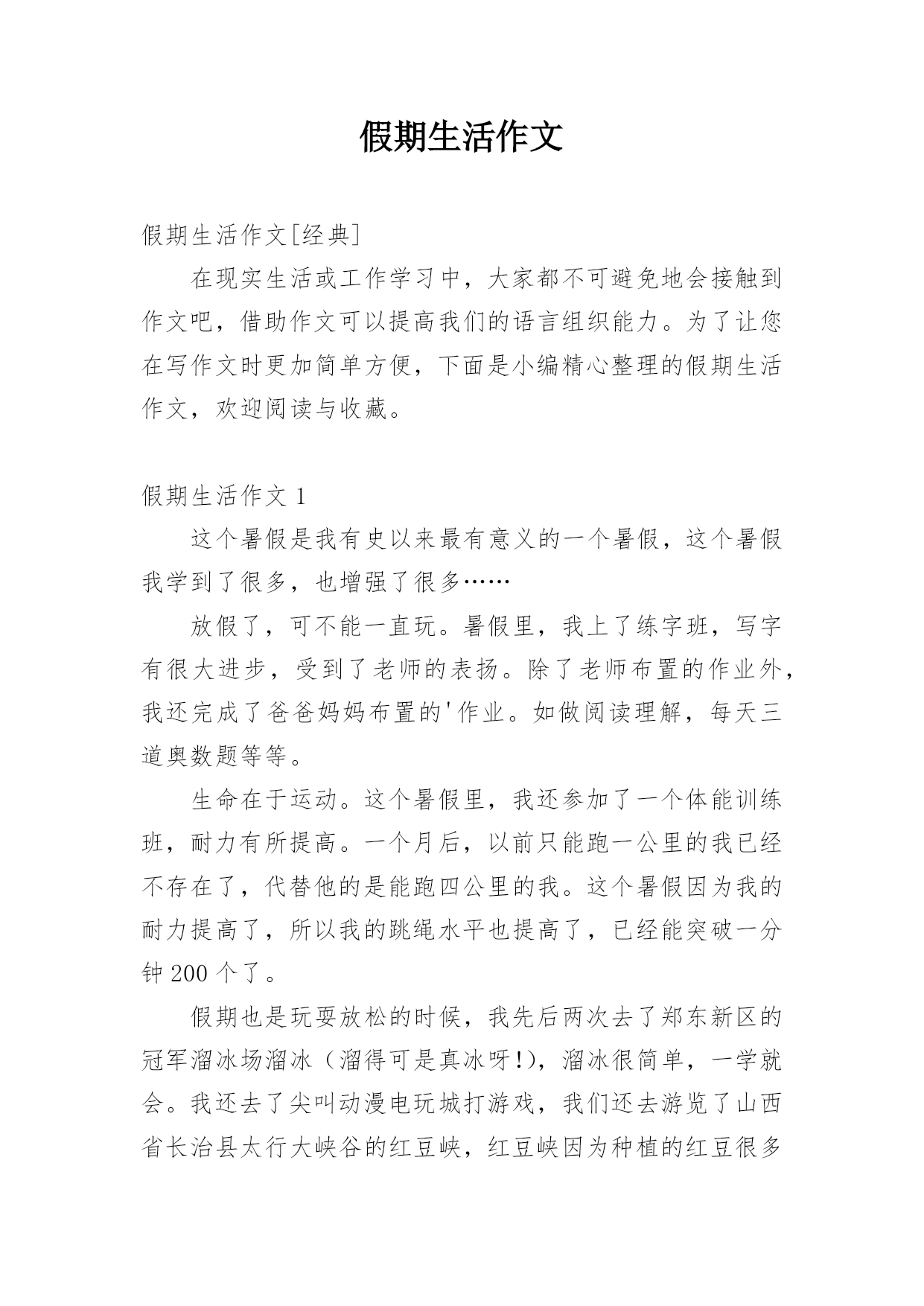 假期生活作文假期生活作文[经典]在现实生活或工作学习中,大家都不可避免地会接触到作文吧,借助作文可以提高我们的语言组织能力。为了让您在写作文时更加简单方便,下面是小编精心整理的假期生活作文,欢迎阅读与收藏。假期生活作文1这个暑假是我有史以来最有意义的一个暑假,这个暑假我学到了很多,也增强了很多……放假了,可不能一直玩。暑假里,我上了练字班,写字有很大进步,受到了老师的表扬。除了老师布置的作业外,我还完成了爸爸妈妈布置的'作业。如做阅读理解,每天三道奥数题等等。生命在于运动。这个暑假里,我还参加了一个体能训