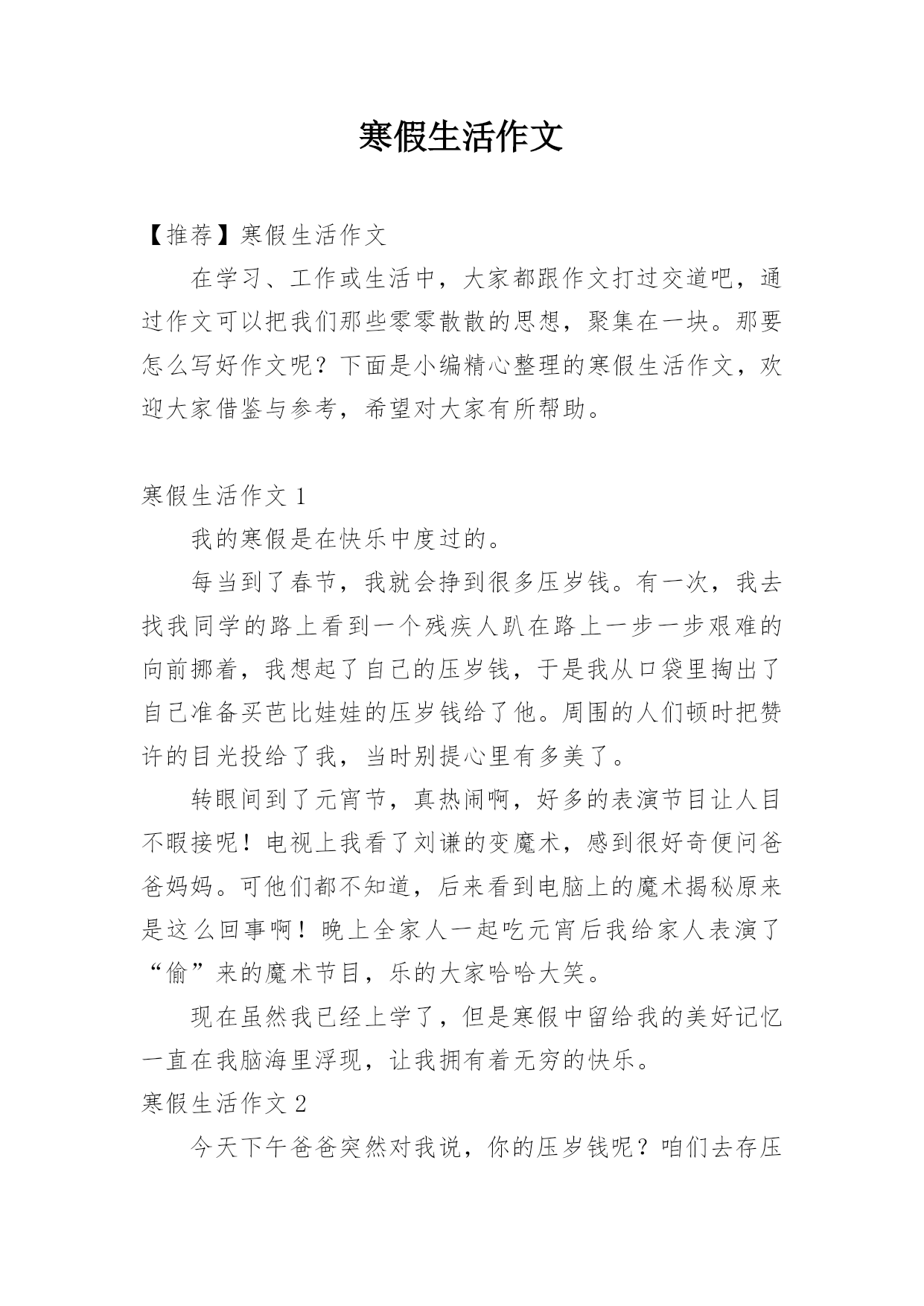 寒假生活作文【推荐】寒假生活作文在学习、工作或生活中,大家都跟作文打过交道吧,通过作文可以把我们那些零零散散的思想,聚集在一块。那要怎么写好作文呢?下面是小编精心整理的寒假生活作文,欢迎大家借鉴与参考,希望对大家有所帮助。寒假生活作文1我的寒假是在快乐中度过的。每当到了春节,我就会挣到很多压岁钱。有一次,我去找我同学的路上看到一个残疾人趴在路上一步一步艰难的向前挪着,我想起了自己的压岁钱,于是我从口袋里掏出了自己准备买芭比娃娃的压岁钱给了他。周围的人们顿时把赞许的目光投给了我,当时别提心里有多美了。转眼间
