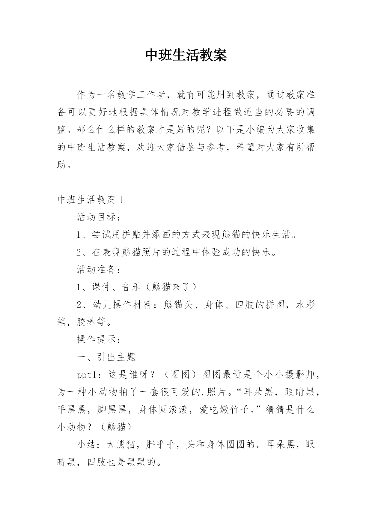 中班生活教案作为一名教学工作者,就有可能用到教案,通过教案准备可以更好地根据具体情况对教学进程做适当的必要的调整。那么什么样的教案才是好的呢?以下是小编为大家收集的中班生活教案,欢迎大家借鉴与参考,希望对大家有所帮助。中班生活教案1活动目标:1、尝试用拼贴并添画的方式表现熊猫的快乐生活。2、在表现熊猫照片的过程中体验成功的快乐。活动准备:1、课件、音乐(熊猫来了)2、幼儿操作材料:熊猫头、身体、四肢的拼图,水彩笔,胶棒等。操作提示:一、引出主题ppt1:这是谁呀?(图图)图图最近是个小小摄影师,为一种小动