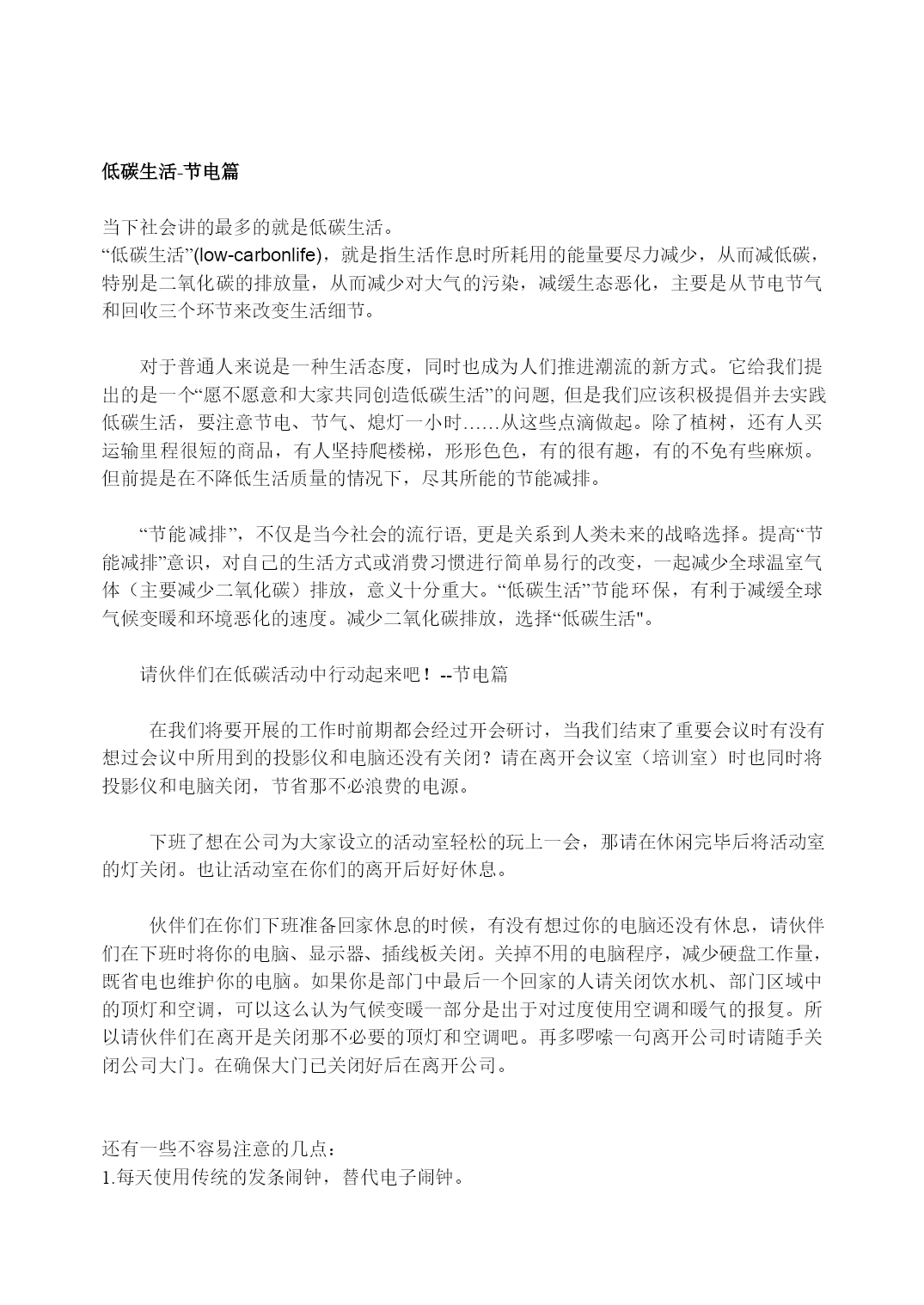 低碳生活-节电篇当下社会讲的最多的就是低碳生活。“低碳生活”(low-carbonlife),就是指生活作息时所耗用的能量要尽力减少,从而减低碳,特别是HYPERLINK"http://baike.baidu.com/view/17816.htm"二氧化碳的排放量,从而减少对HYPERLINK"http://baike.baidu.com/view/2759.htm"大气的污染,减缓HYPERLINK"http://baike.baidu.com/view/10382.htm"生态恶化,