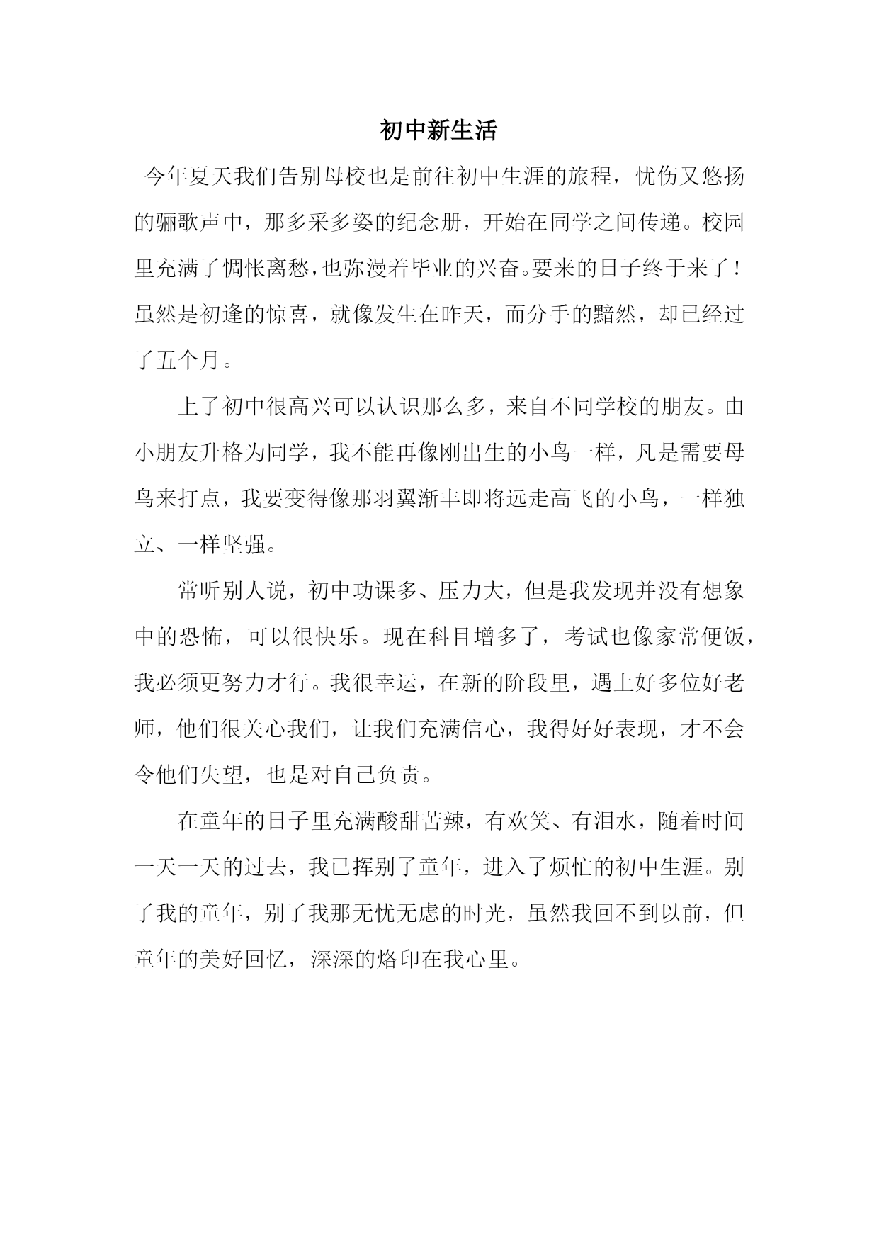初中新生活今年夏天我们告别母校也是前往初中生涯的旅程,忧伤又悠扬的骊歌声中,那多采多姿的纪念册,开始在同学之间传递。校园里充满了惆怅离愁,也弥漫着毕业的兴奋。要来的日子终于来了!虽然是初逢的惊喜,就像发生在昨天,而分手的黯然,却已经过了五个月。上了初中很高兴可以认识那么多,来自不同学校的朋友。由小朋友升格为同学,我不能再像刚出生的小鸟一样,凡是需要母鸟来打点,我要变得像那羽翼渐丰即将远走高飞的小鸟,一样独立、一样坚强。常听别人说,初中功课多、压力大,但是我发现并没有想象中的恐怖,可以很快乐。现在科目增多了