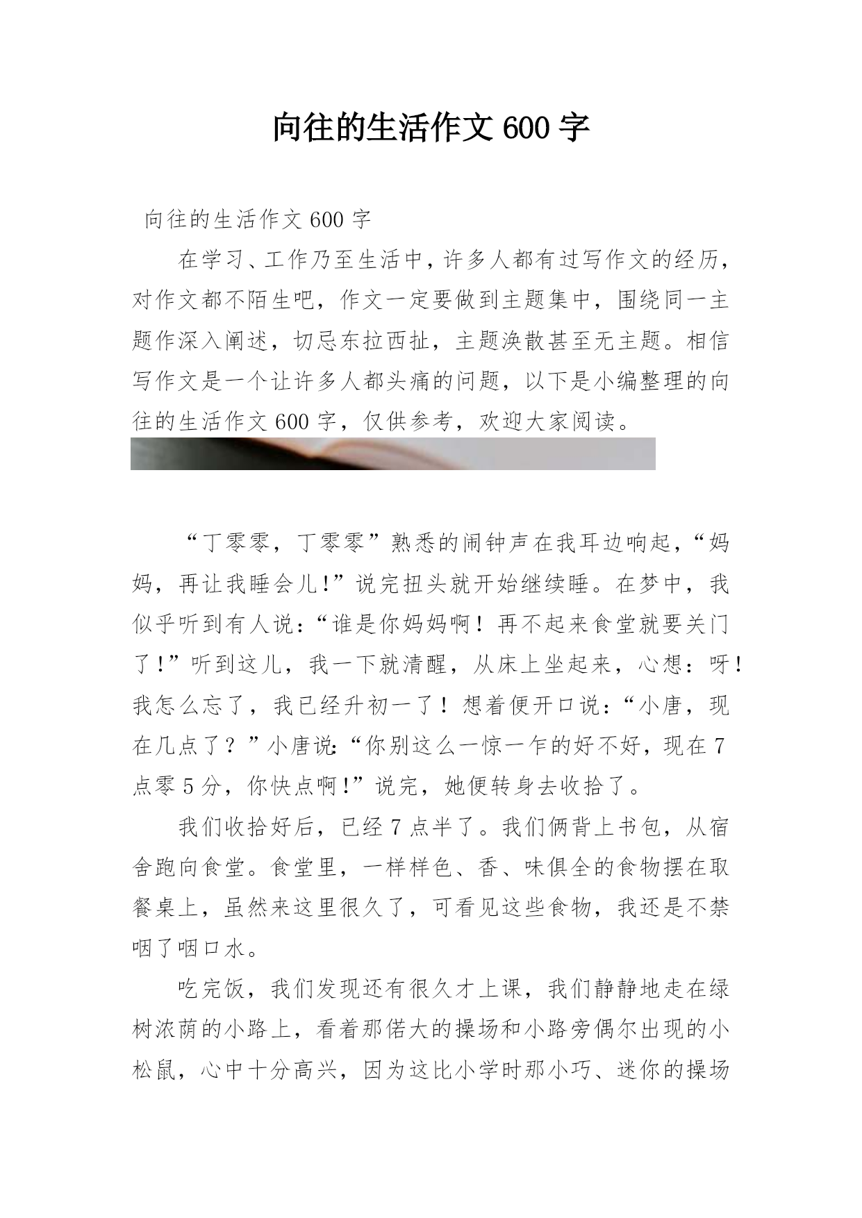 向往的生活作文600字向往的生活作文600字在学习、工作乃至生活中,许多人都有过写作文的经历,对作文都不陌生吧,作文一定要做到主题集中,围绕同一主题作深入阐述,切忌东拉西扯,主题涣散甚至无主题。相信写作文是一个让许多人都头痛的问题,以下是小编整理的向往的生活作文600字,仅供参考,欢迎大家阅读。“丁零零,丁零零”熟悉的闹钟声在我耳边响起,“妈妈,再让我睡会儿!”说完扭头就开始继续睡。在梦中,我似乎听到有人说:“谁是你妈妈啊!再不起来食堂就要关门了!”听到这儿,我一下就清醒,从床上坐起来,心想:呀!我怎么忘