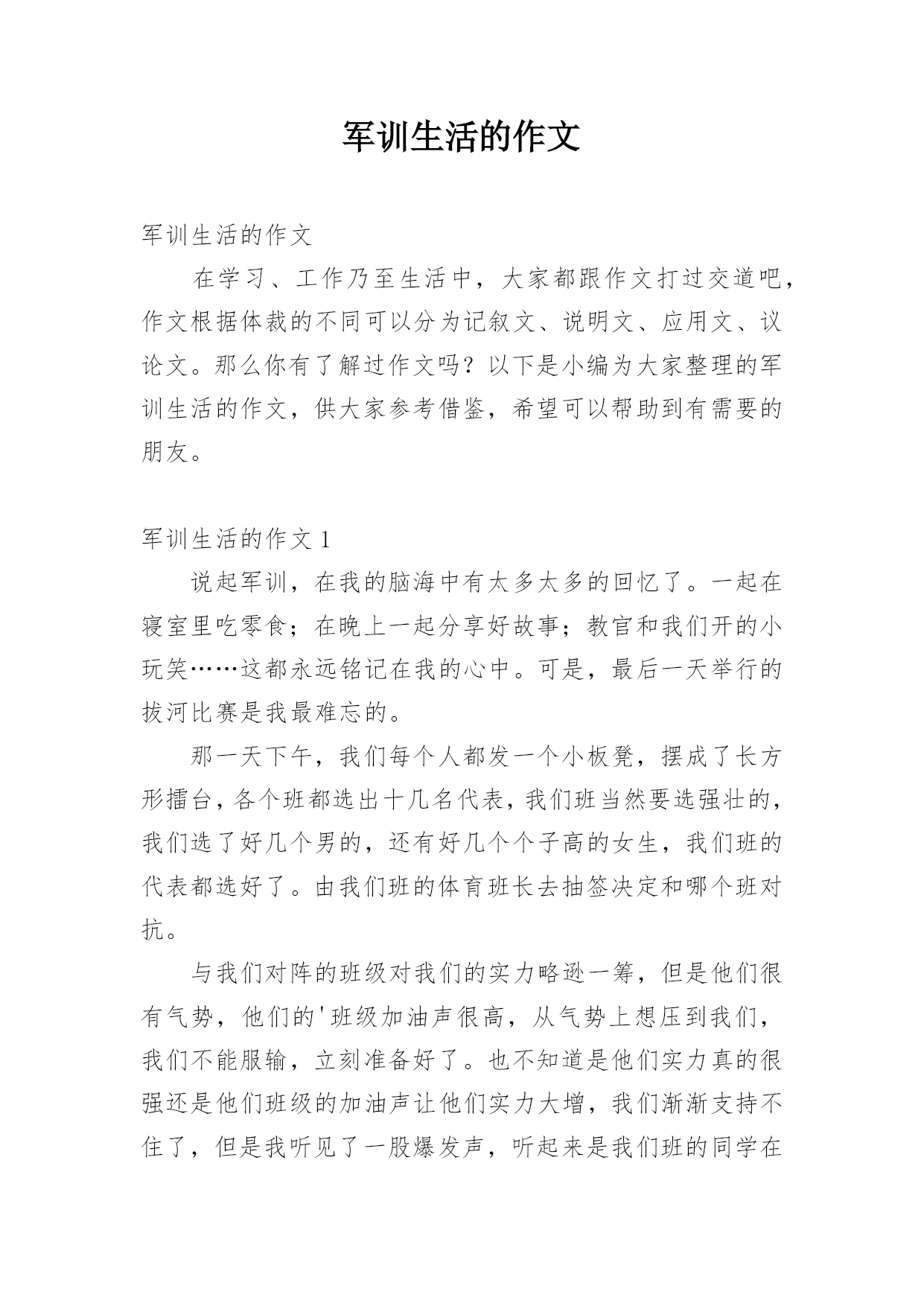 军训生活的作文军训生活的作文在学习、工作乃至生活中,大家都跟作文打过交道吧,作文根据体裁的不同可以分为记叙文、说明文、应用文、议论文。那么你有了解过作文吗?以下是小编为大家整理的军训生活的作文,供大家参考借鉴,希望可以帮助到有需要的朋友。军训生活的作文1说起军训,在我的脑海中有太多太多的回忆了。一起在寝室里吃零食;在晚上一起分享好故事;教官和我们开的小玩笑……这都永远铭记在我的心中。可是,最后一天举行的拔河比赛是我最难忘的。那一天下午,我们每个人都发一个小板凳,摆成了长方形擂台,各个班都选出十几名代表,我